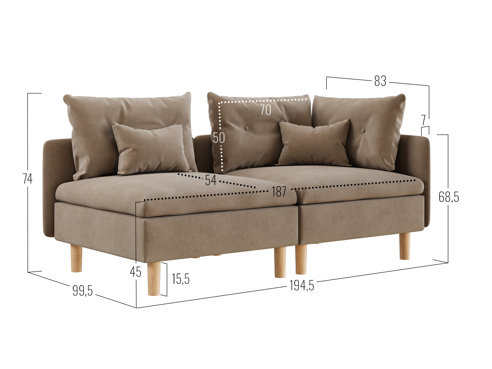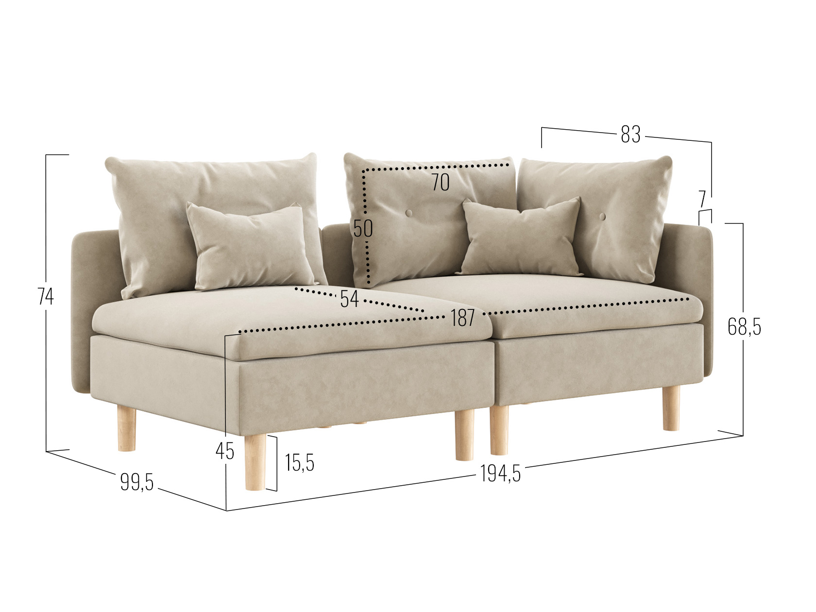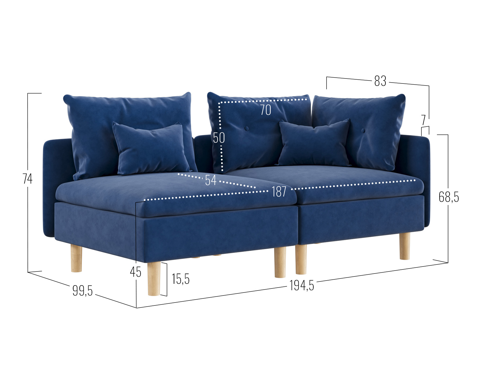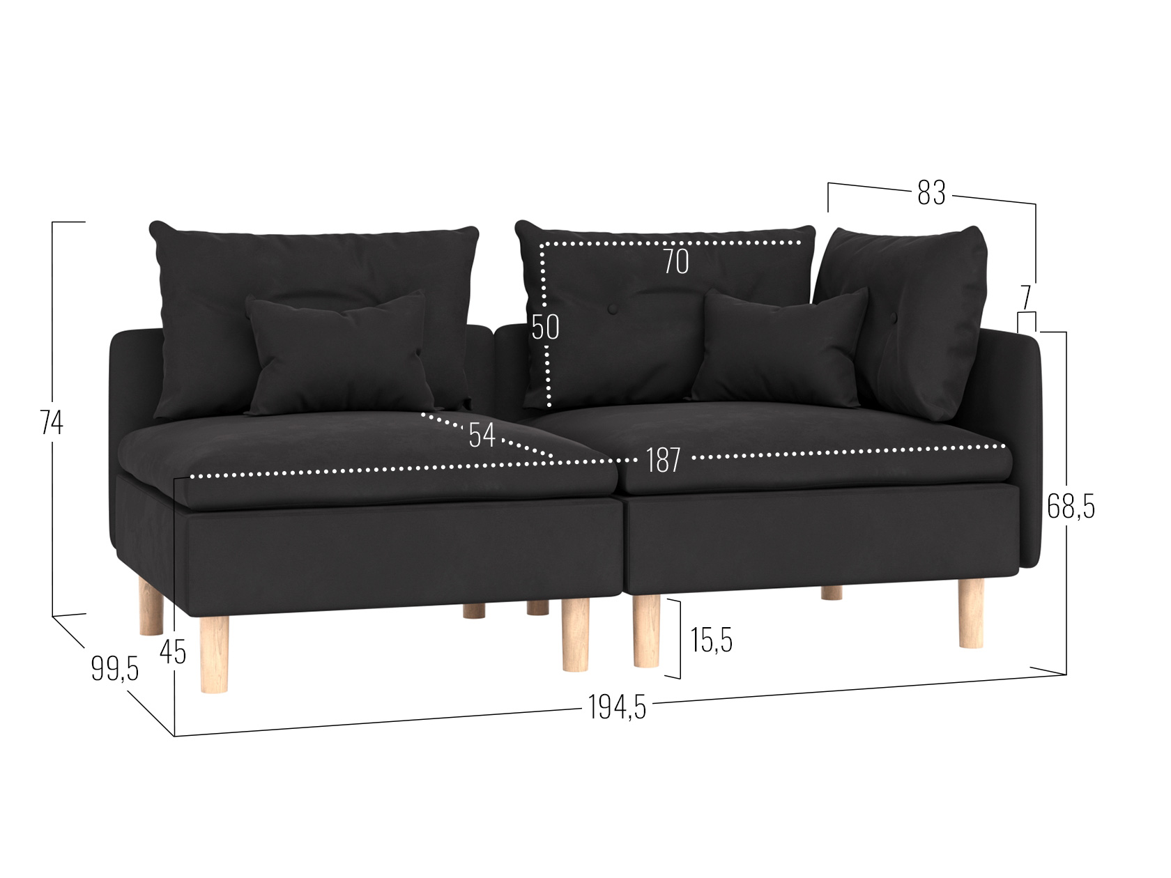 Угловое кресло: 74 х 99,5 х 99,5 см.