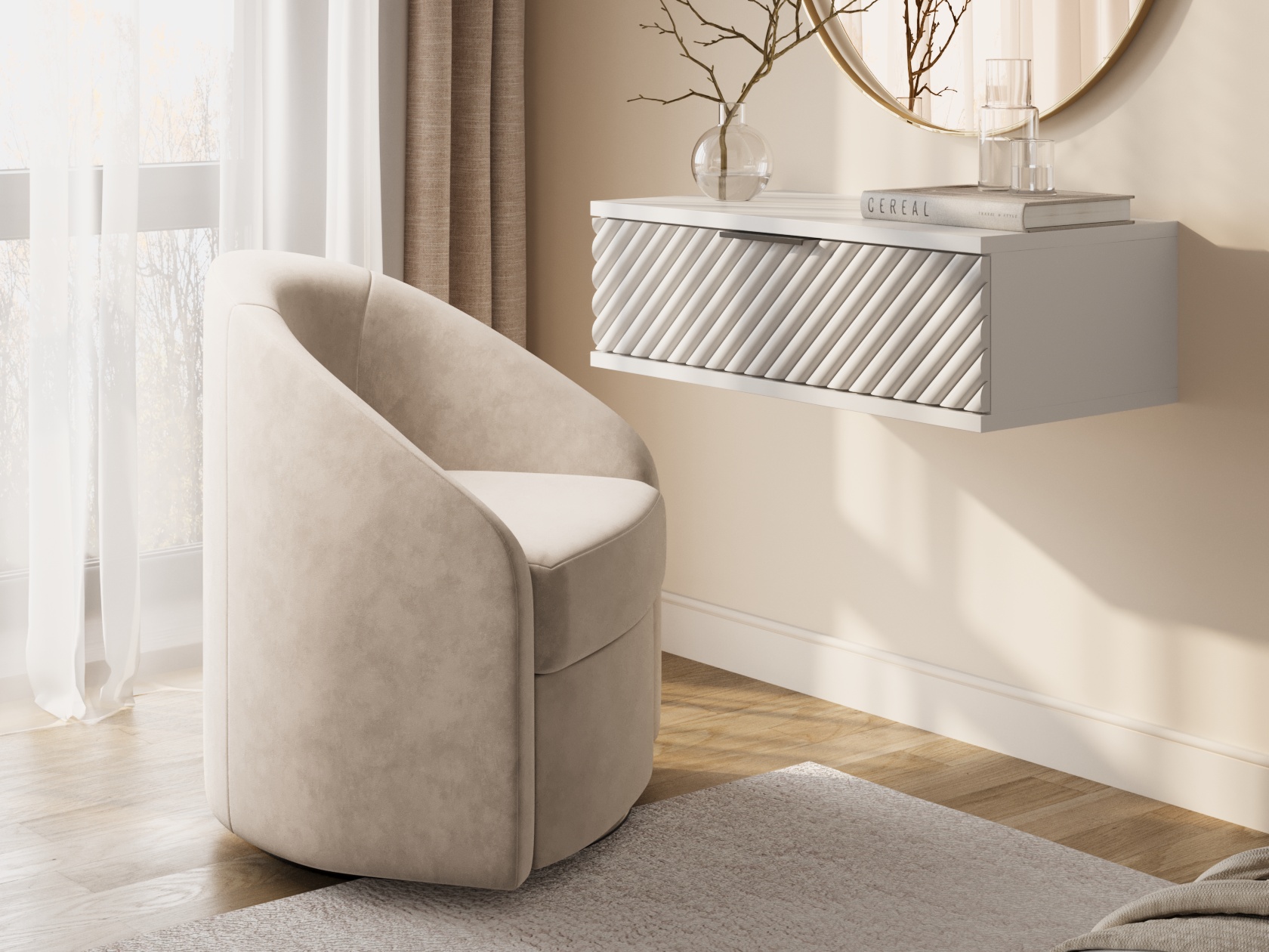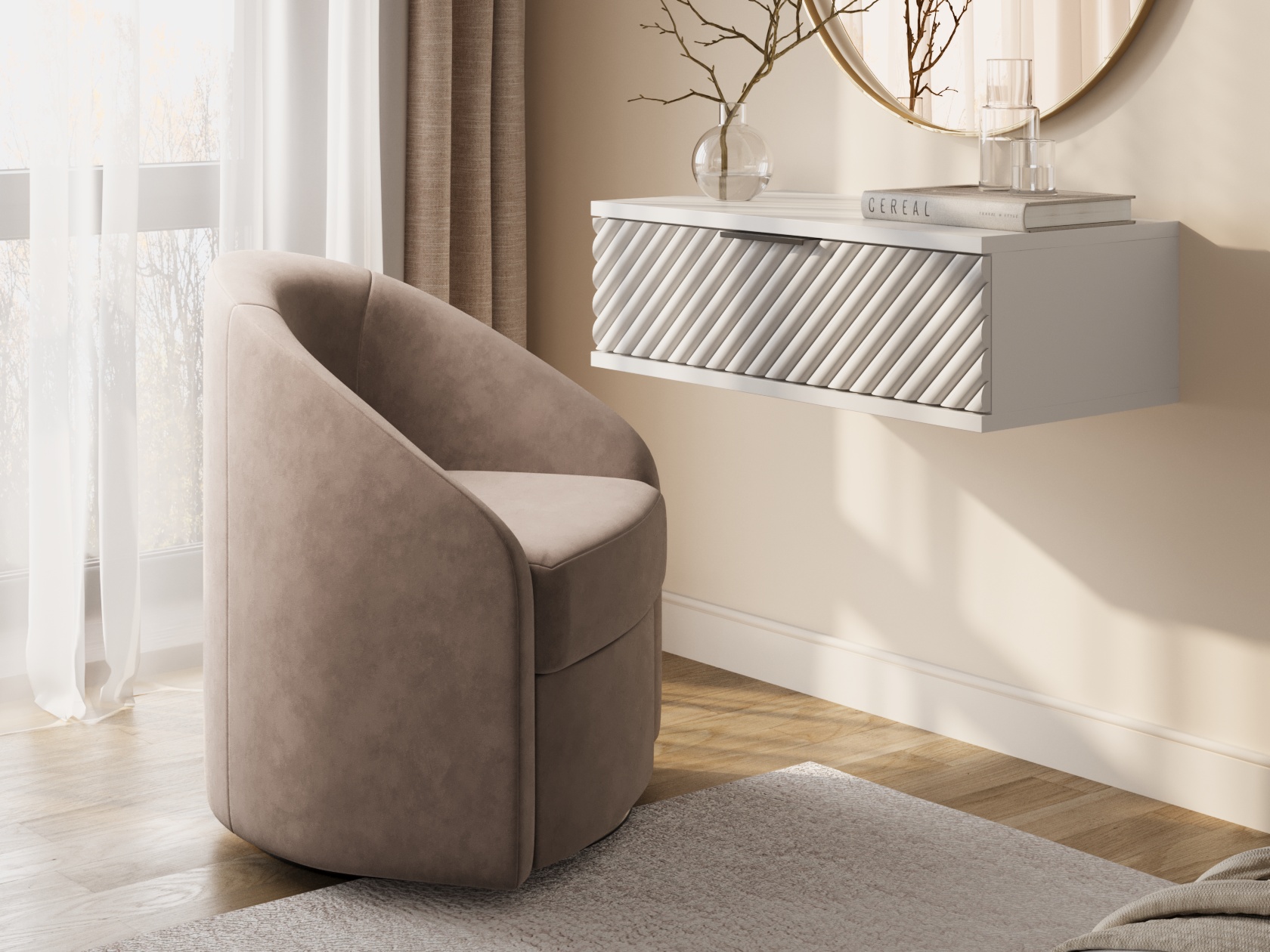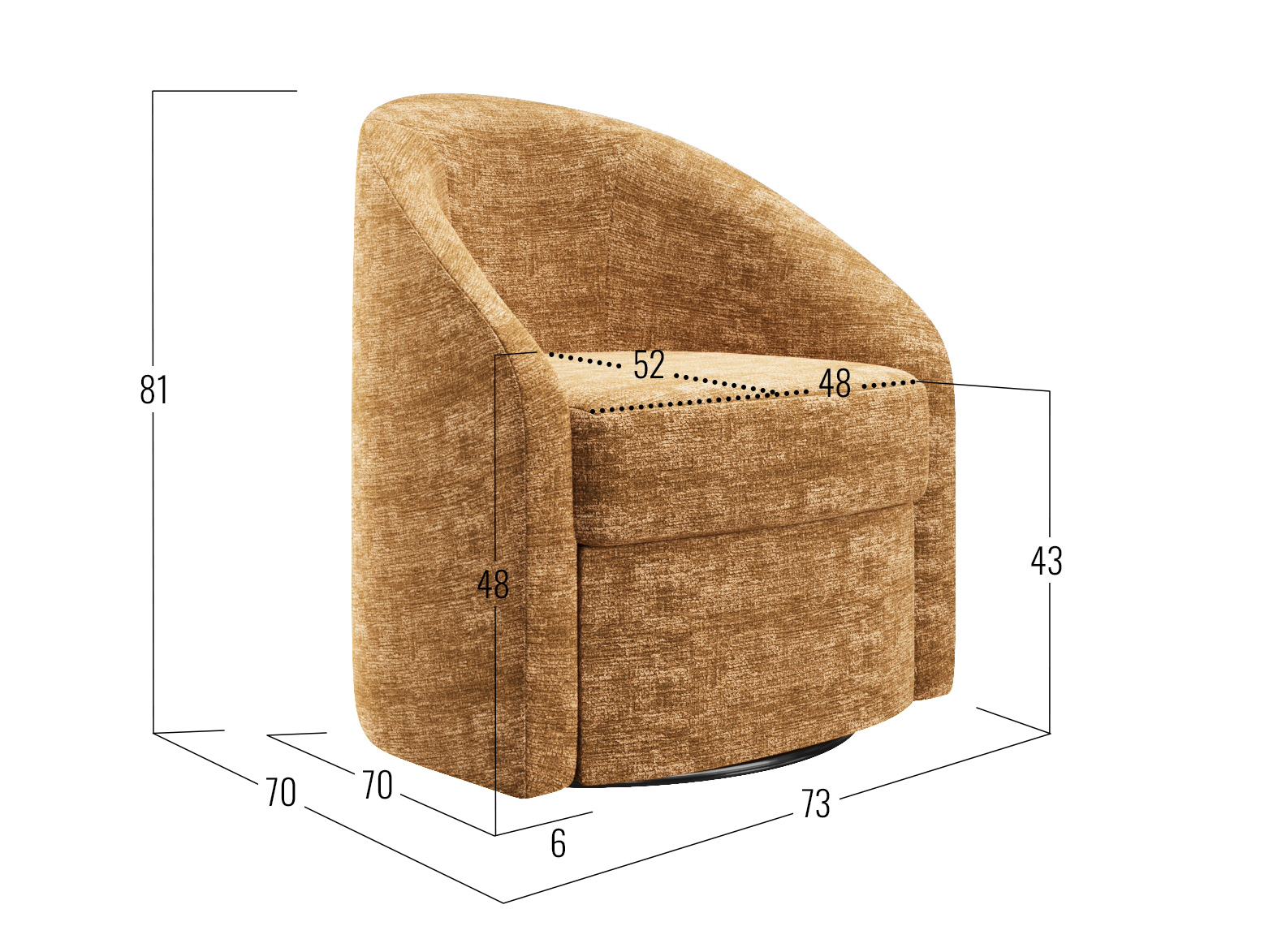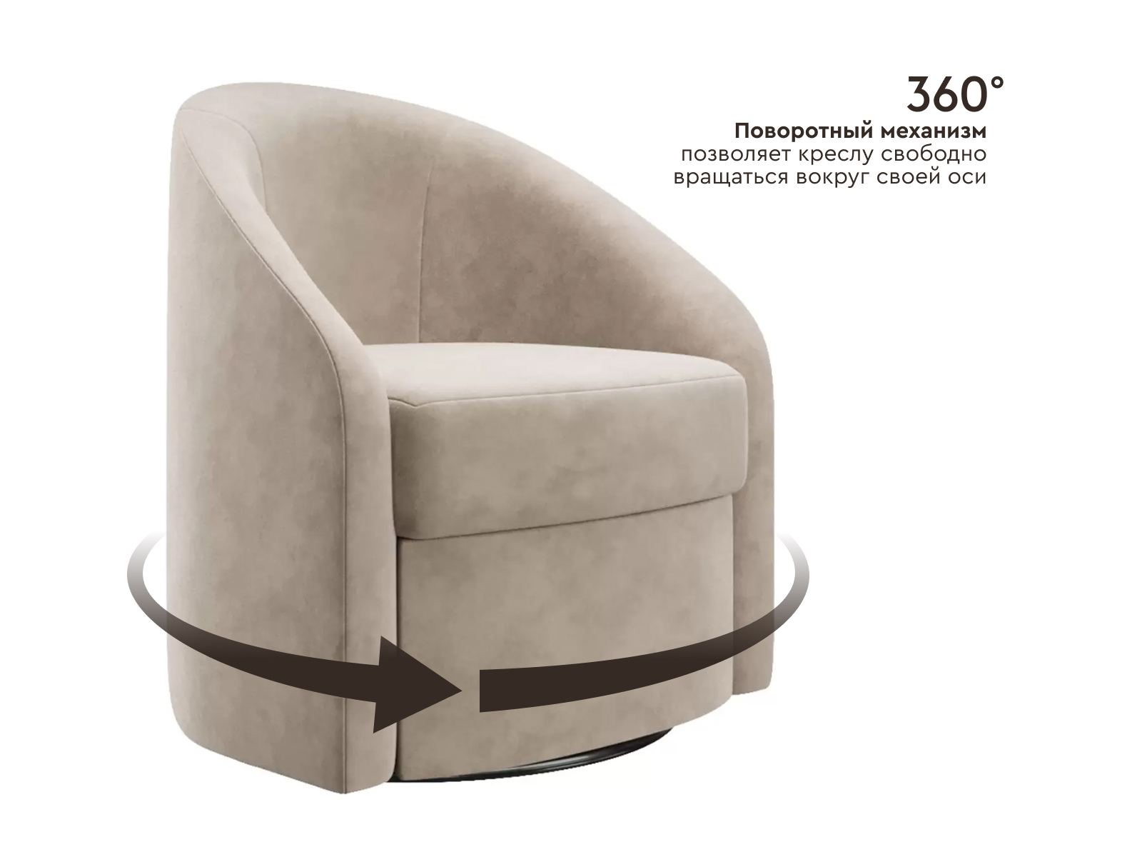 Компактные габариты позволяют интегрировать модель даже в небольшую комнату без ущерба пространству. Плавная форма спинки, переходящая в подлокотники, создает расслабляющую атмосферу. Удобная глубина сиденья помогает уютно устроиться с книгой или чашечкой чая. Обивка из приятного на ощупь материала обеспечивает комфортные ощущения во время отдыха. Металлическое круглое основание с поворотным механизмом позволяет свободно вращаться вокруг своей оси.