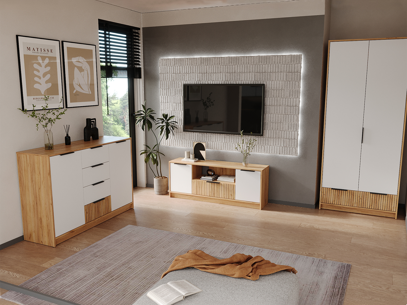 Разноплановые отделения помогут поддерживать порядок в комнате. Центральная часть украшена фотопечатью. Мягкий древесный оттенок в сочетании с матовыми фасадами добавит обстановке уютный акцент.