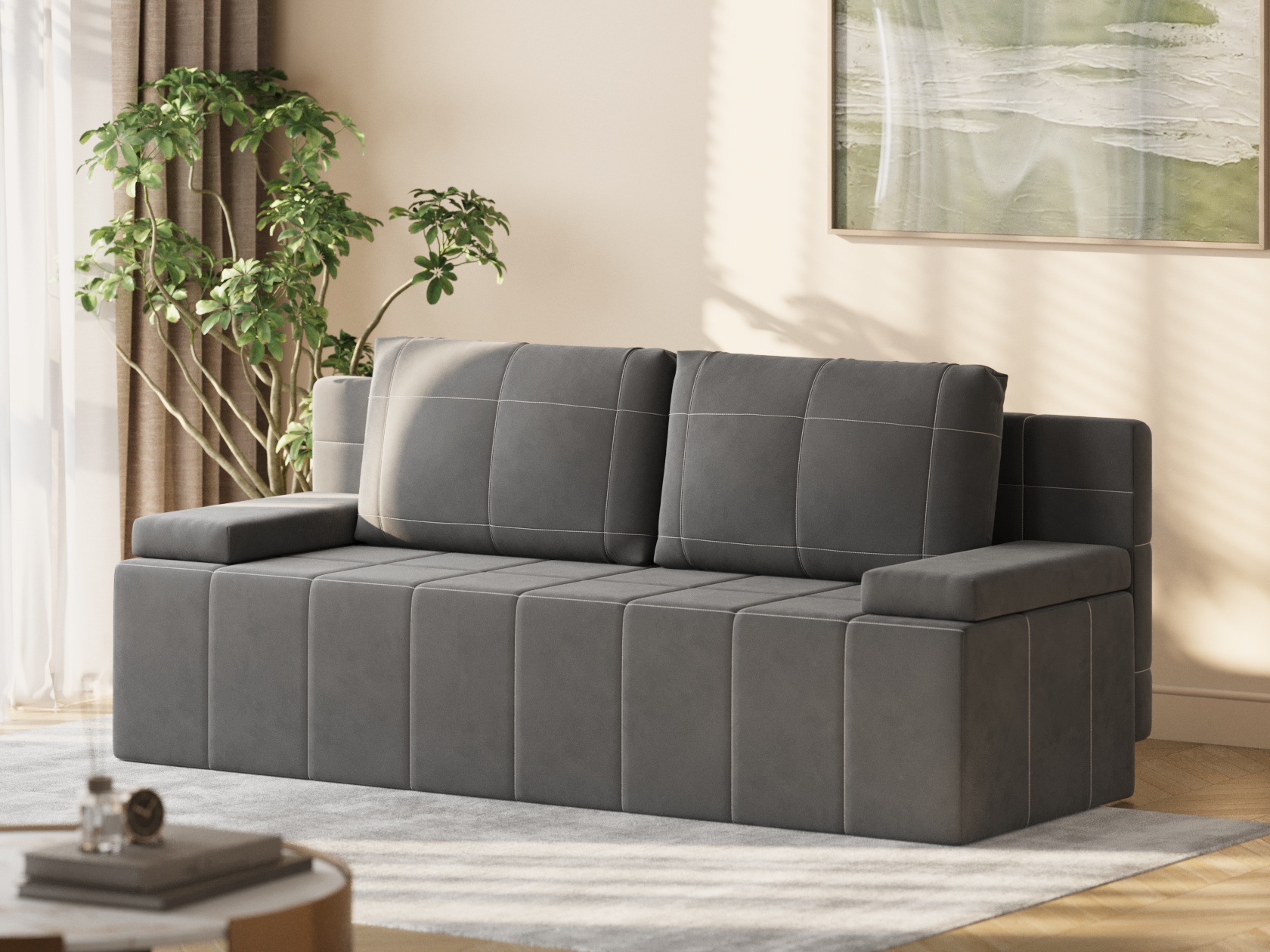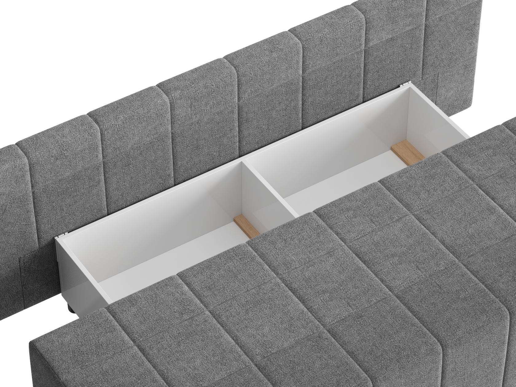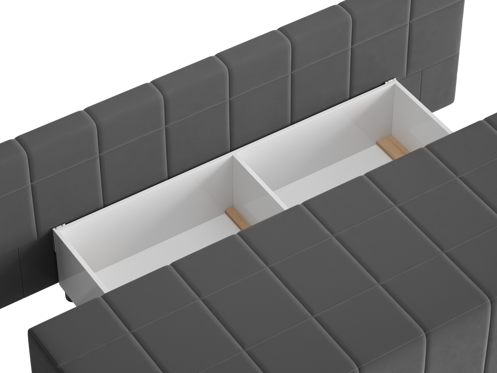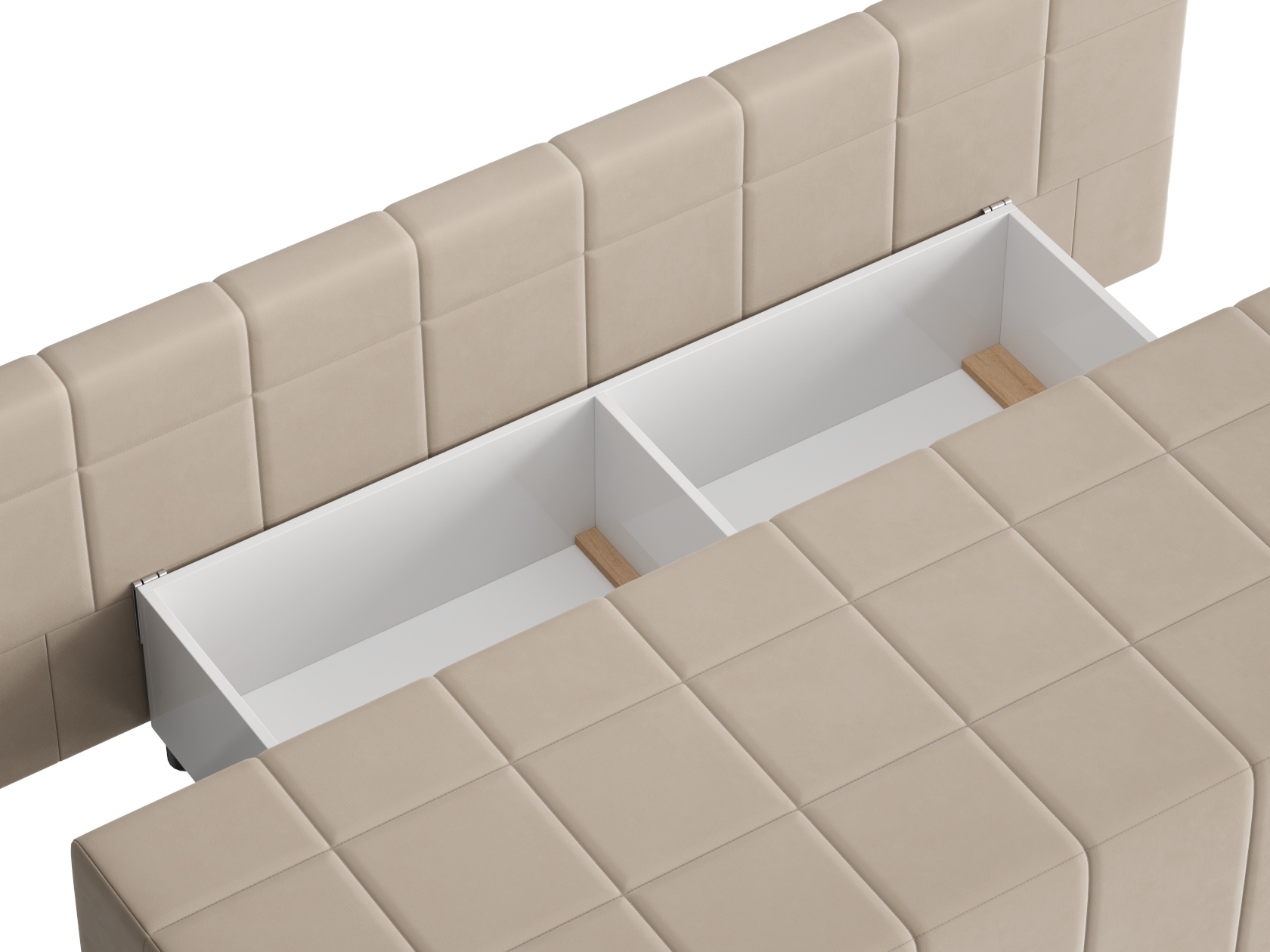 Деревянный каркас обеспечивает прочность и долговечность конструкции, а простой и надежный механизм трансформации быстро превращает диван в спальное место. В основании расположен ящик для белья с двумя отдельными секциями, что помогает упорядочить хранение постельных принадлежностей.
