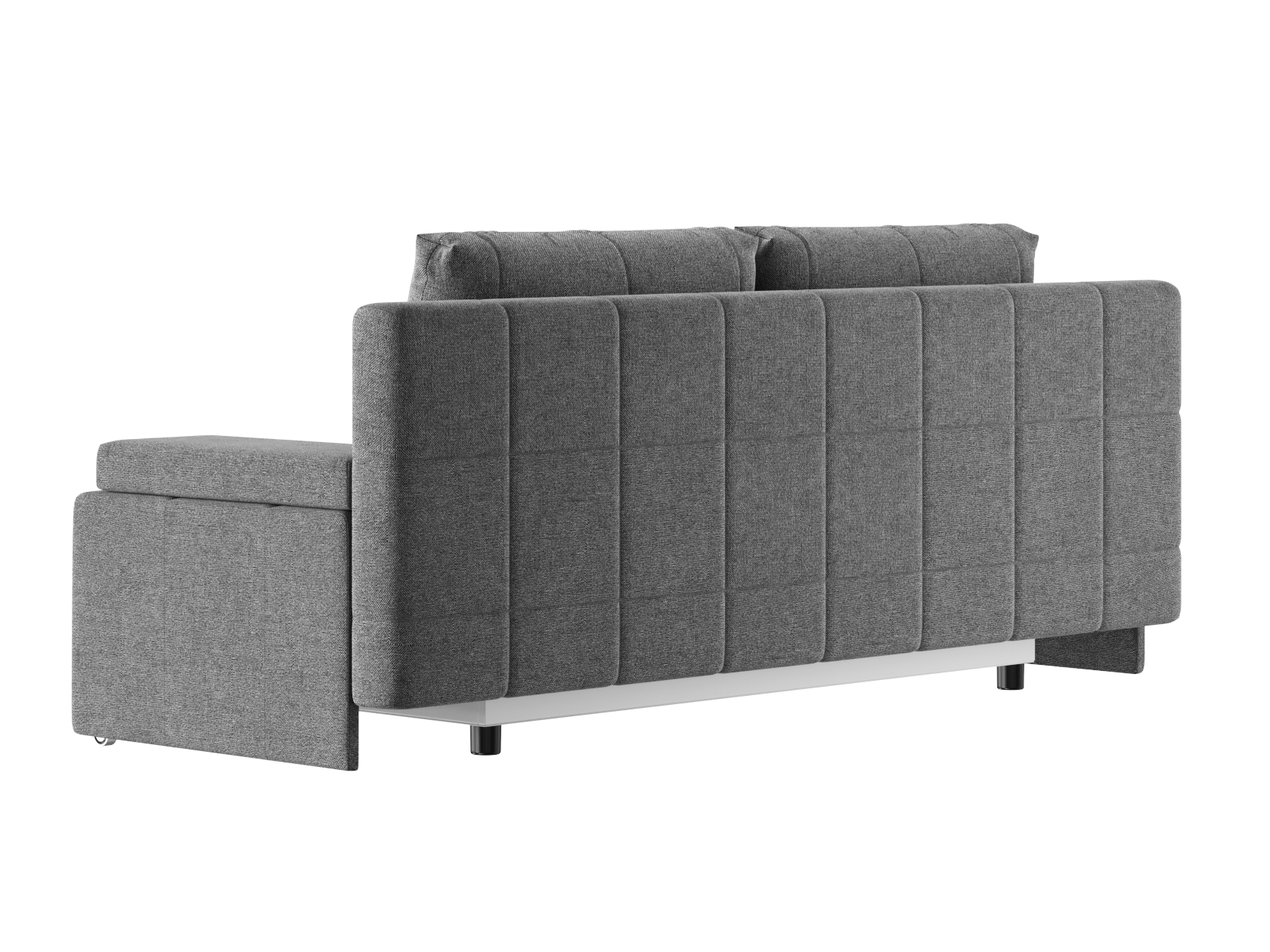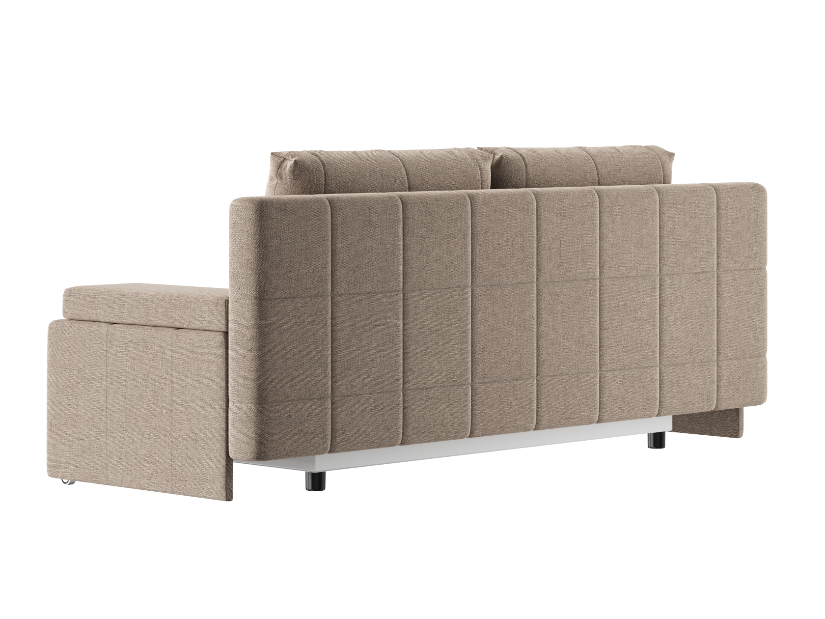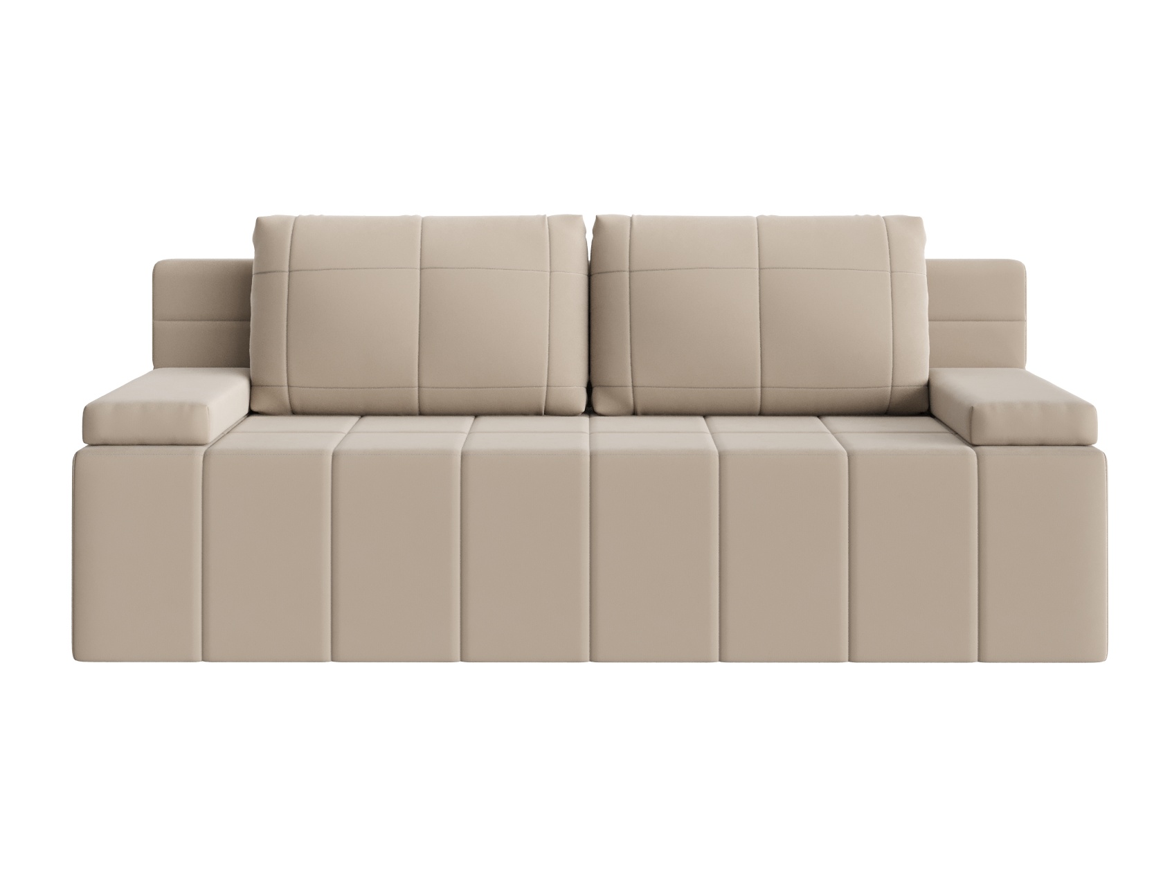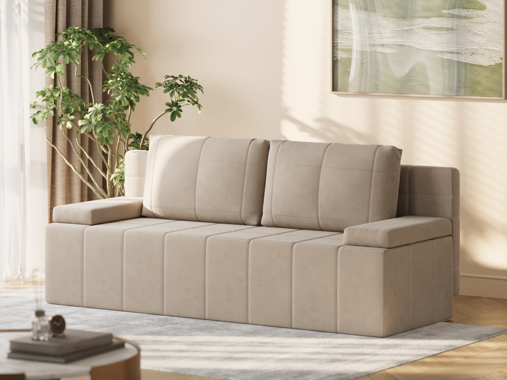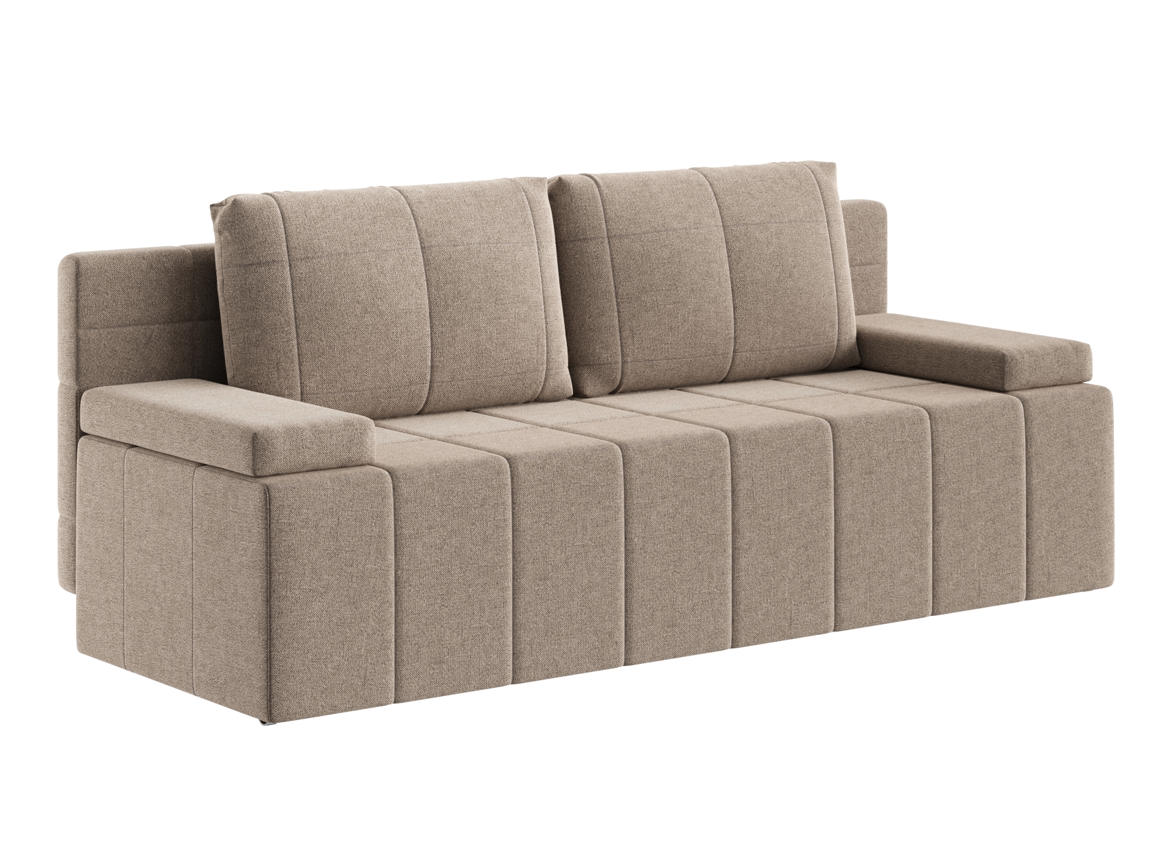 Деревянный каркас обеспечивает прочность и долговечность конструкции, а простой и надежный механизм трансформации быстро превращает диван в спальное место. В основании расположен ящик для белья с двумя отдельными секциями, что помогает упорядочить хранение постельных принадлежностей.