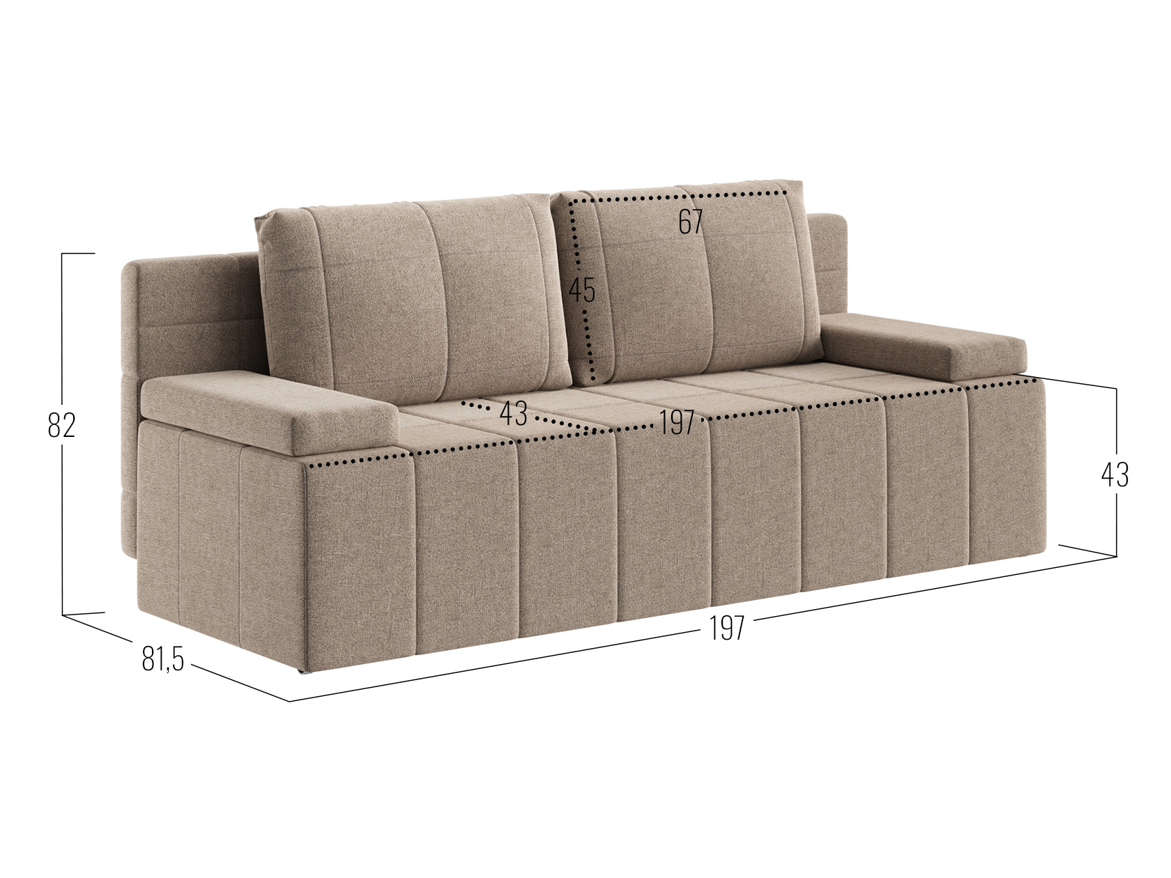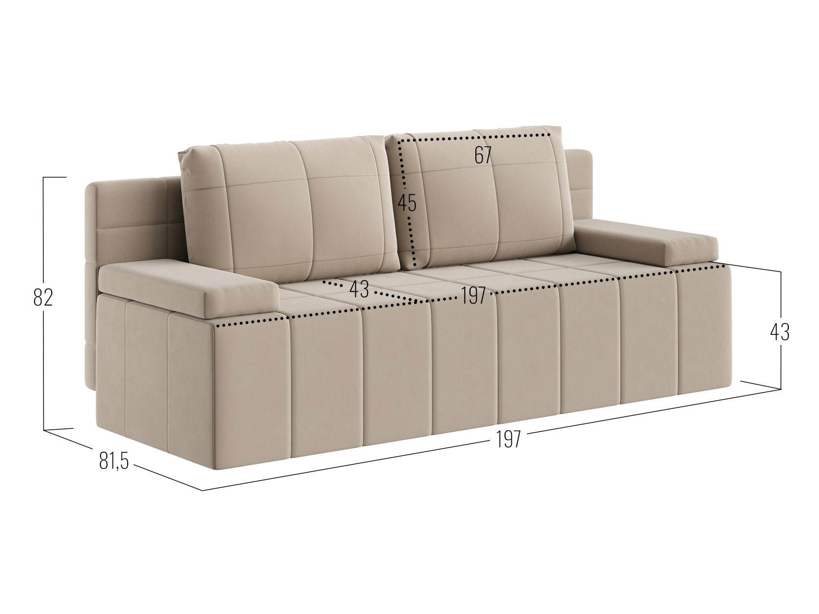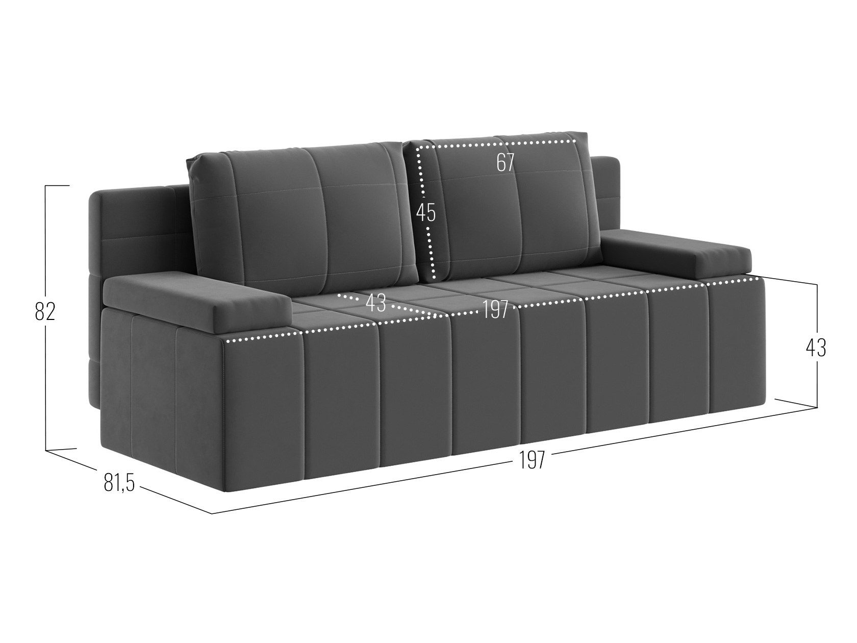 Посадочное место без подушек (ШхГ): 197 х 67 см.