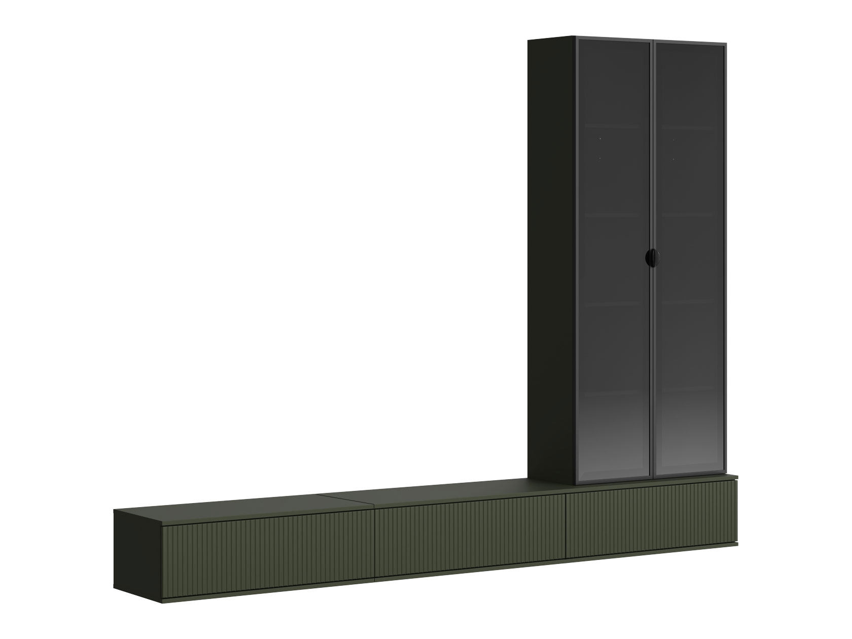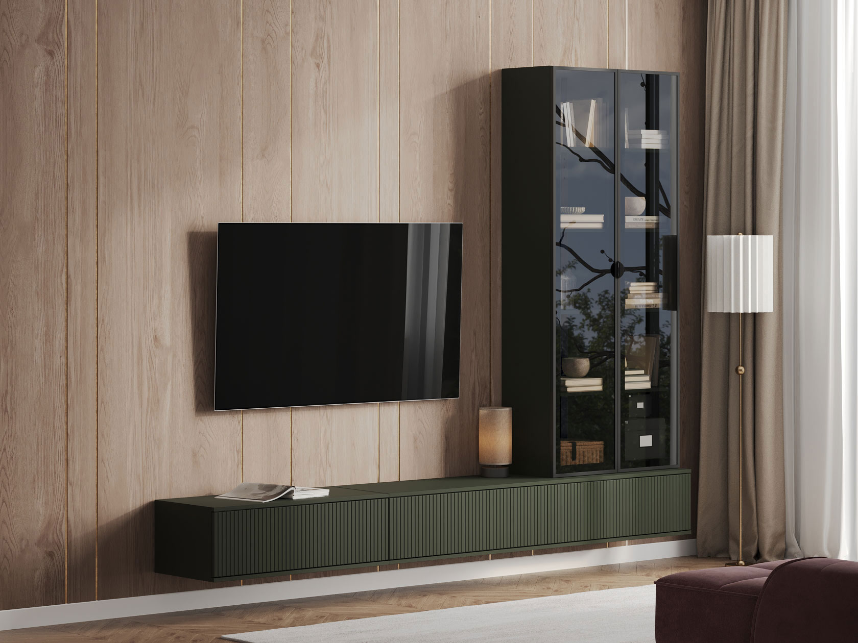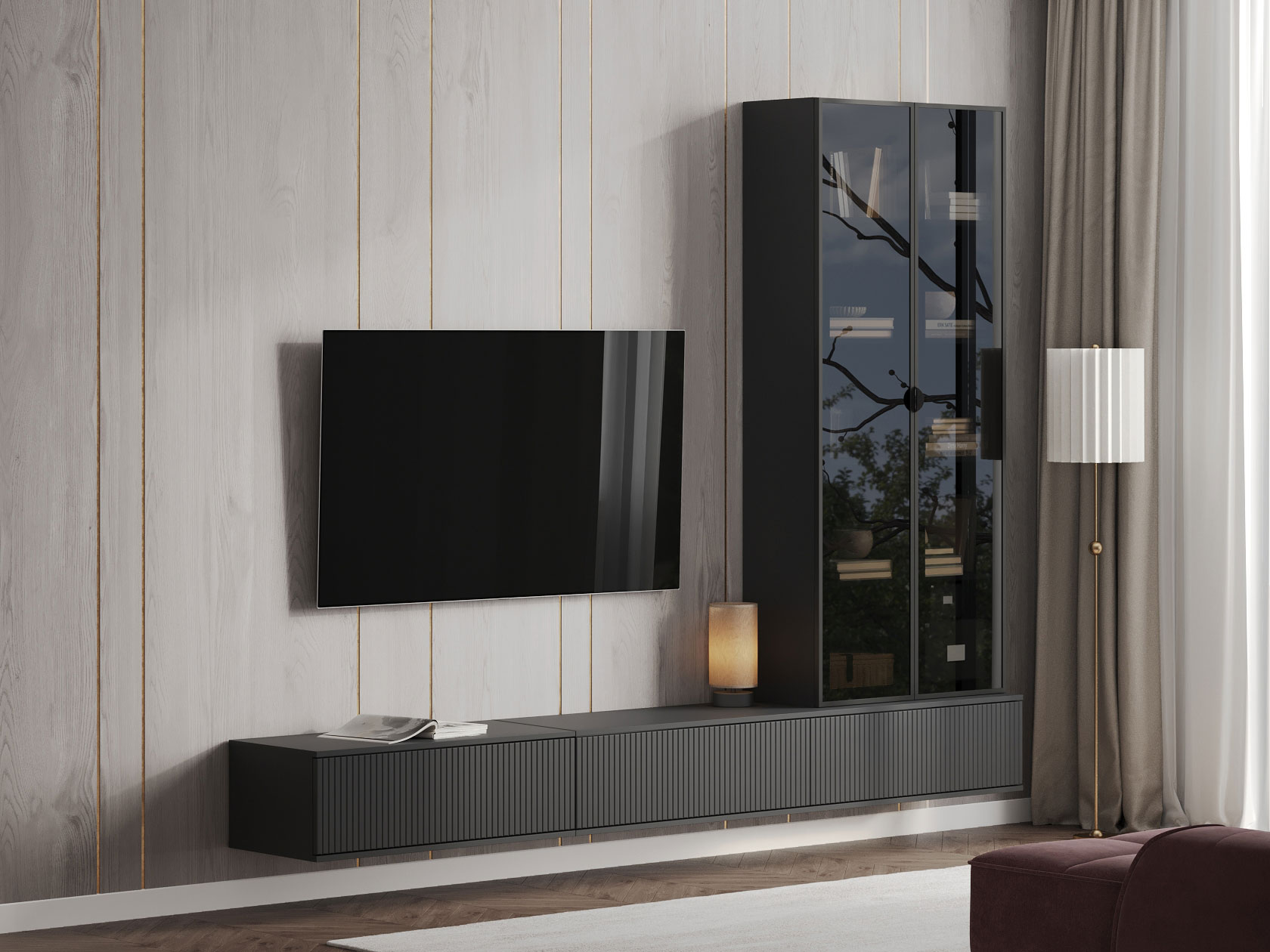 Функциональный набор мебели позволяет найти место для мультимедиа-системы и другой техники, а также аккуратно хранить книги, документы и предметы декора. Тонированные витрины надежно защищают содержимое от пыли и солнечного света.
