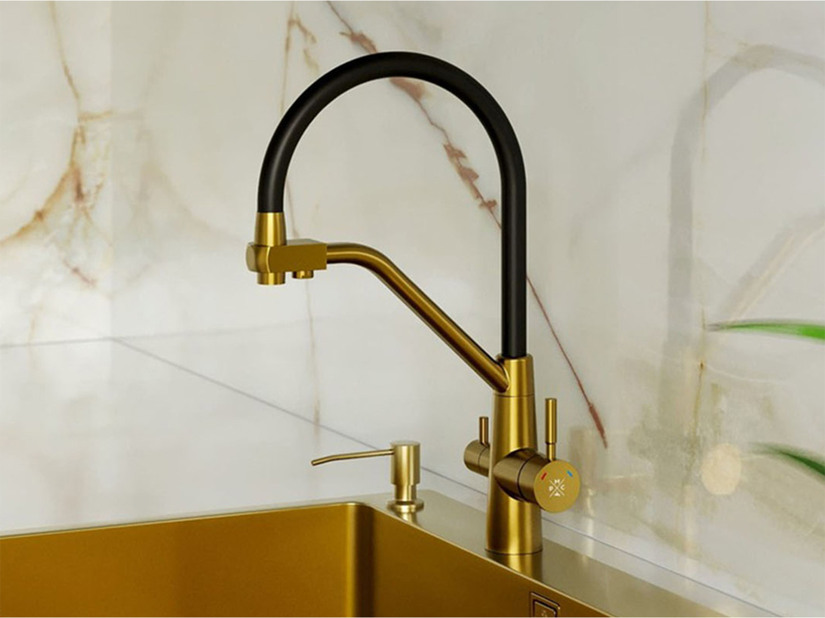 Тип смесителя: двухрычажный, с гибким изливом, с подключением фильтра, с аэратором.