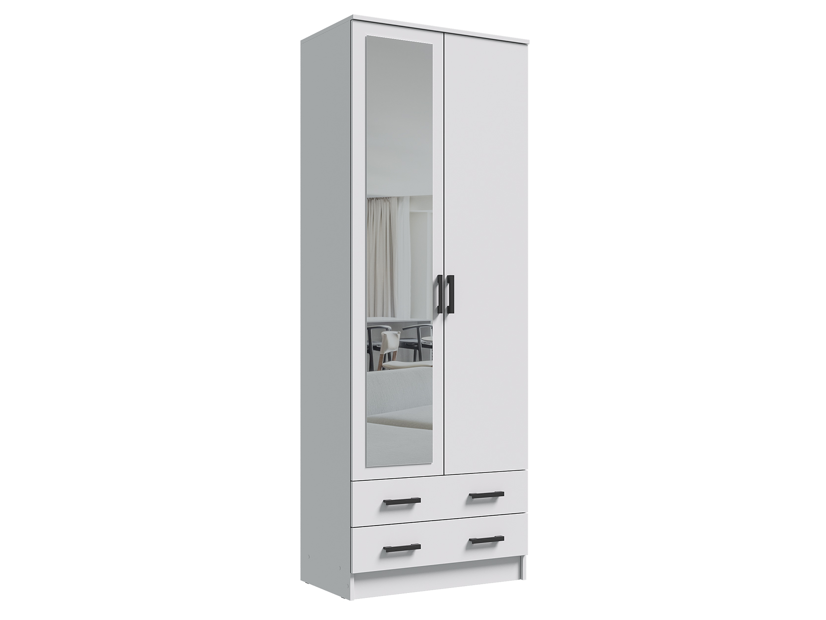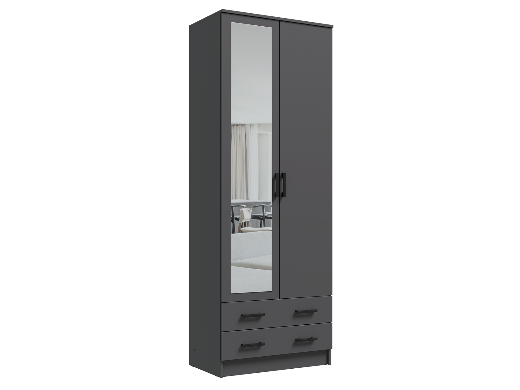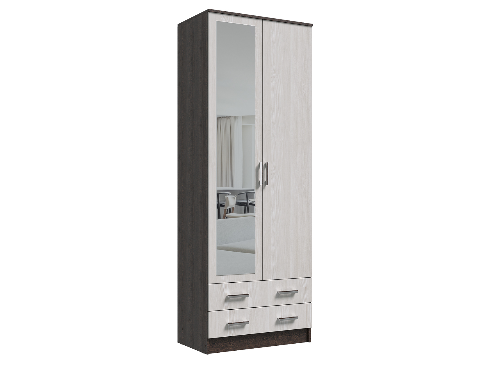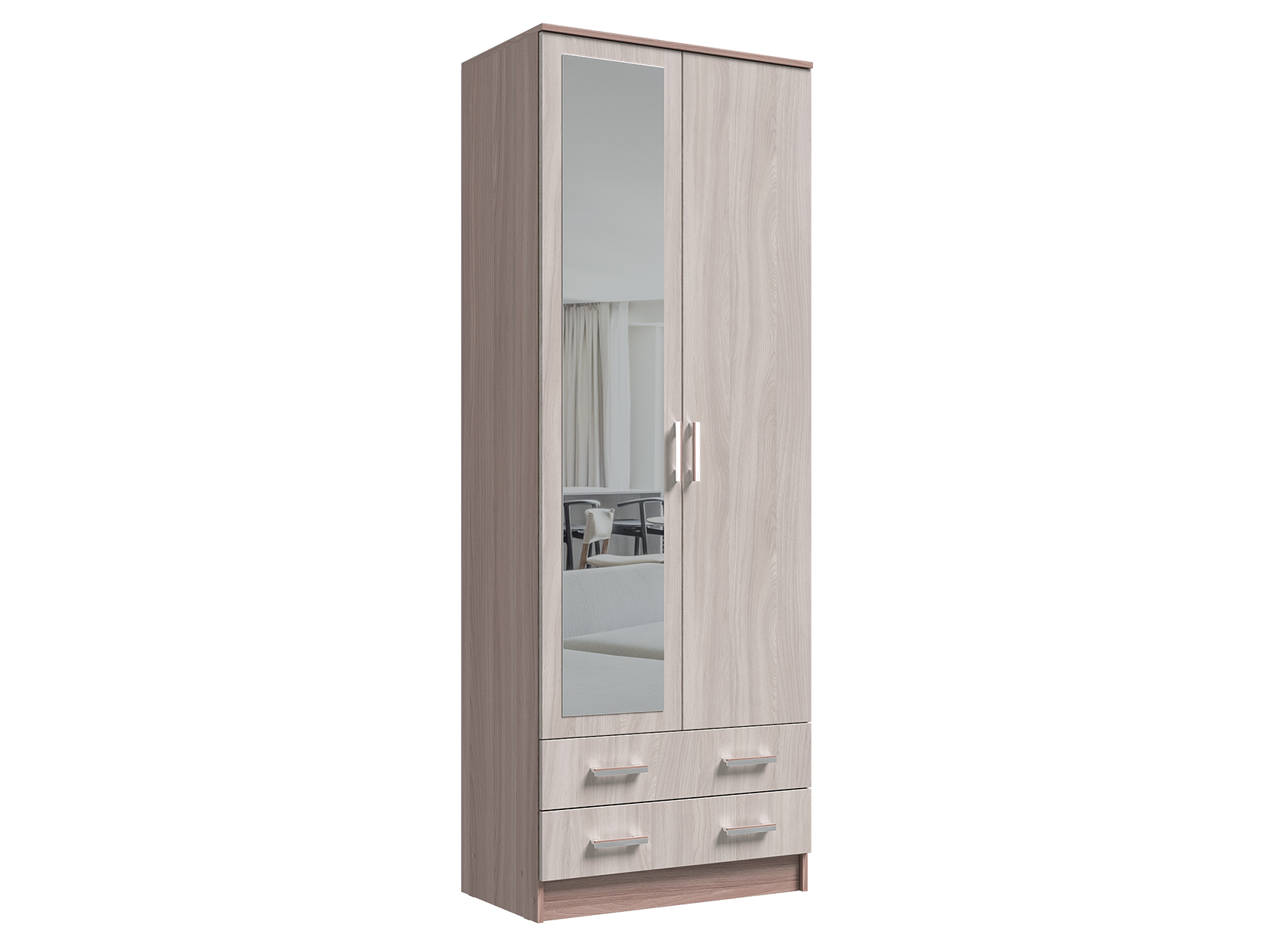 Модель без лишних декоративных деталей гармонично дополнит современный интерьер. Благодаря продуманному наполнению шкаф добавит функционала даже небольшой комнате. Полноразмерное зеркало визуально расширит комнату и выручит, когда нужно рассмотреть свое отражение в полный рост.