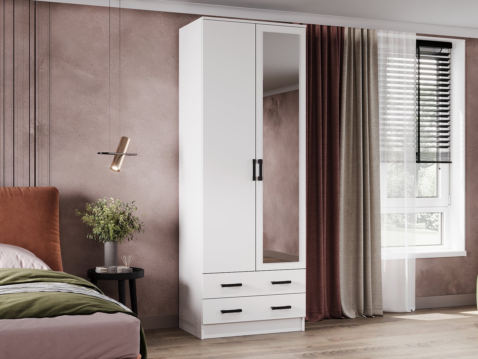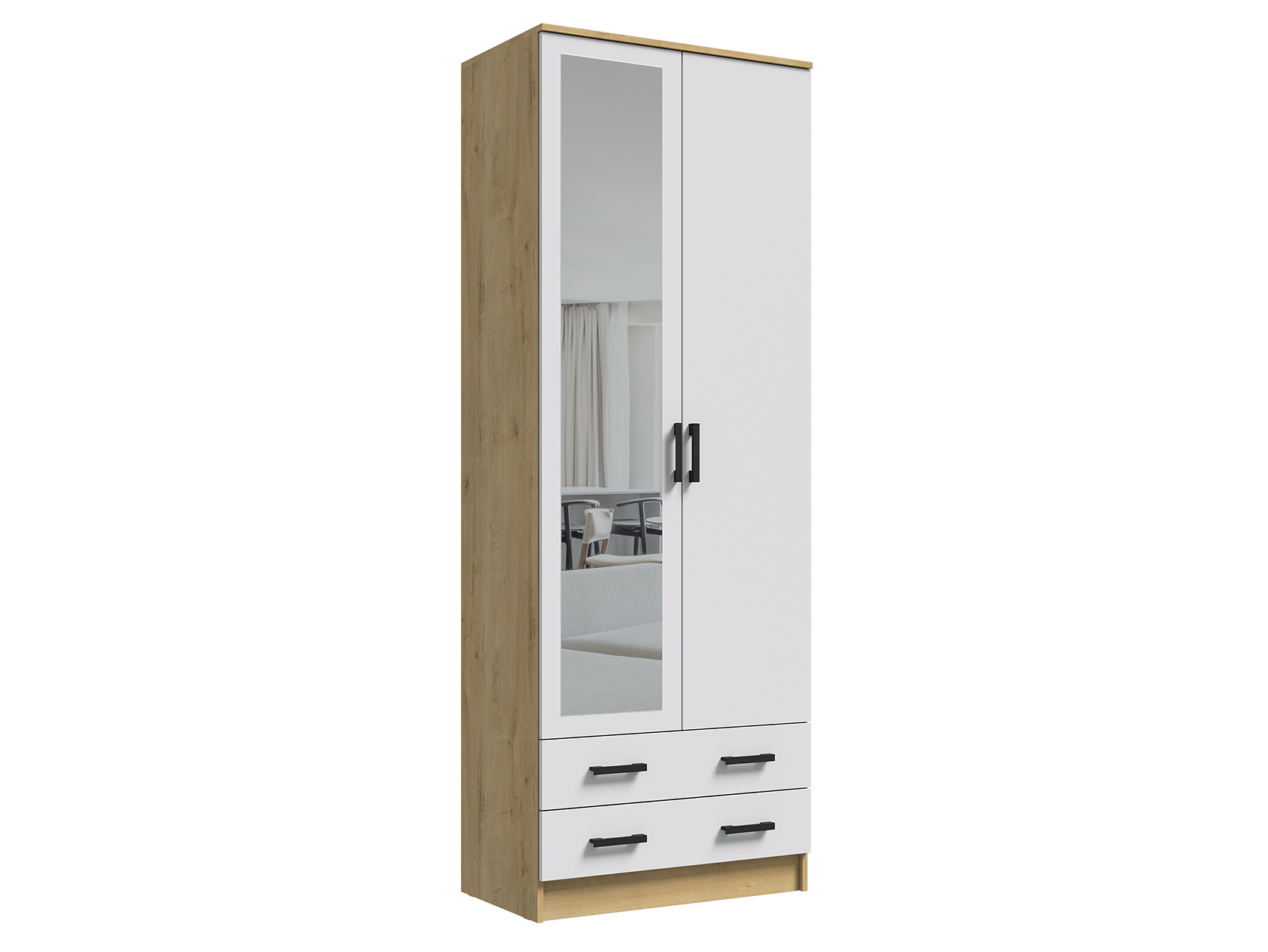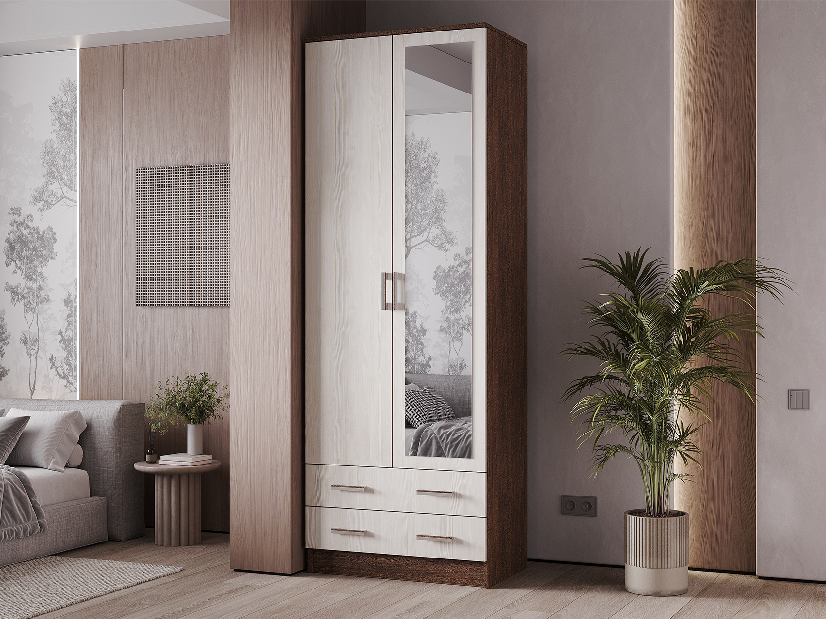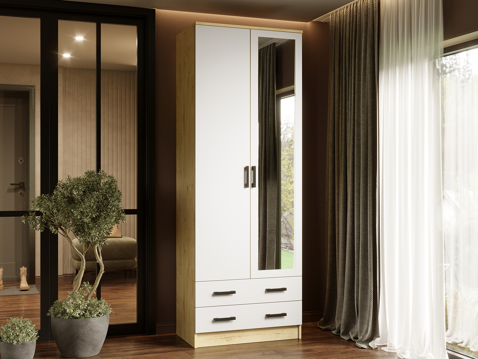 Модель без лишних декоративных деталей гармонично дополнит современный интерьер. Благодаря продуманному наполнению шкаф добавит функционала даже небольшой комнате. Полноразмерное зеркало визуально расширит комнату и выручит, когда нужно рассмотреть свое отражение в полный рост.