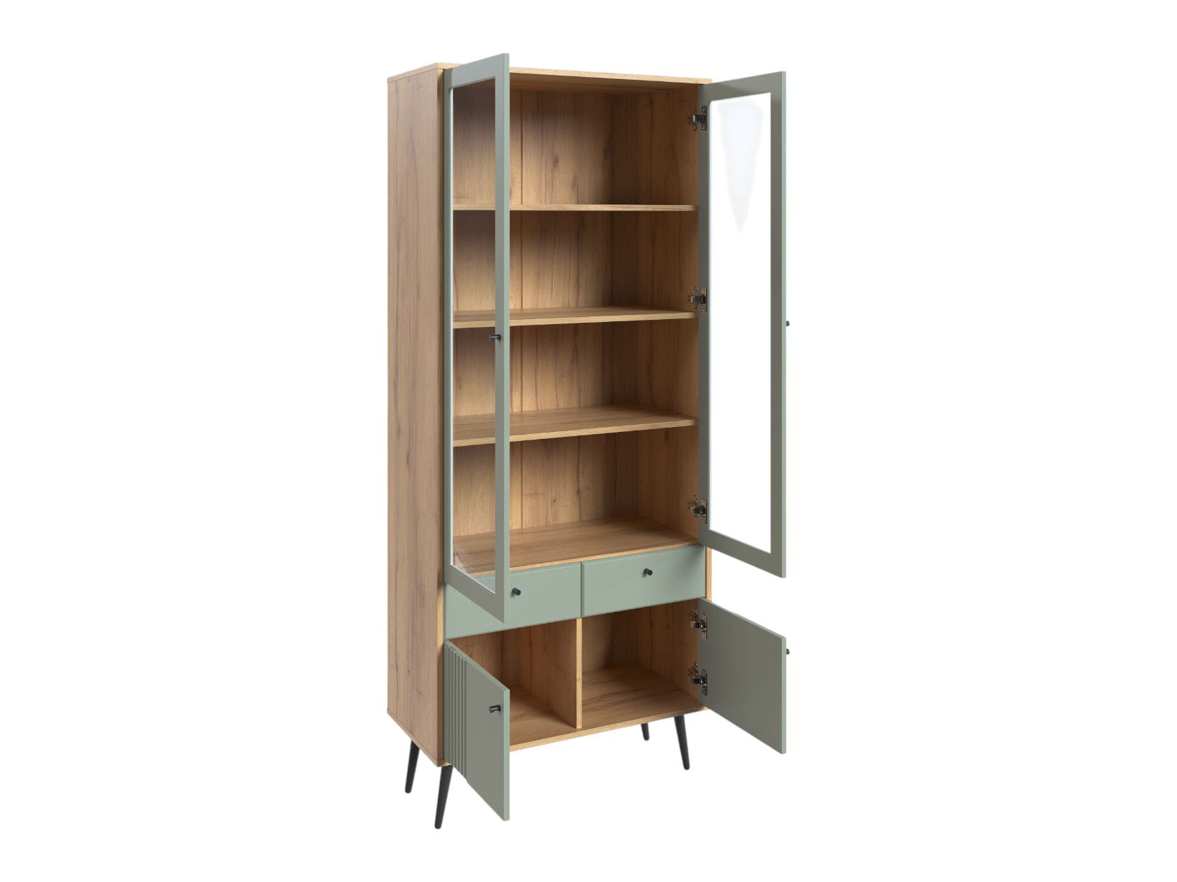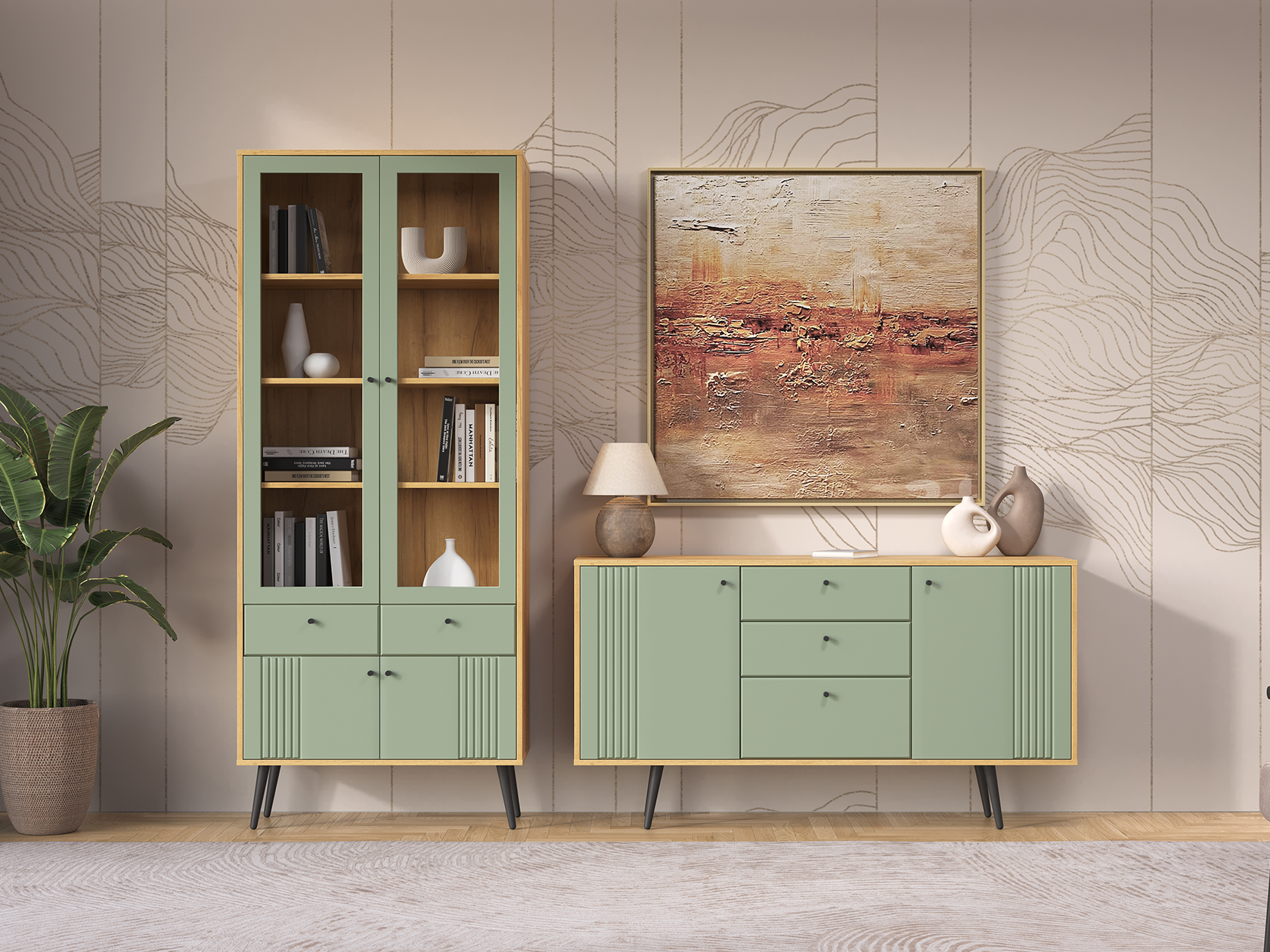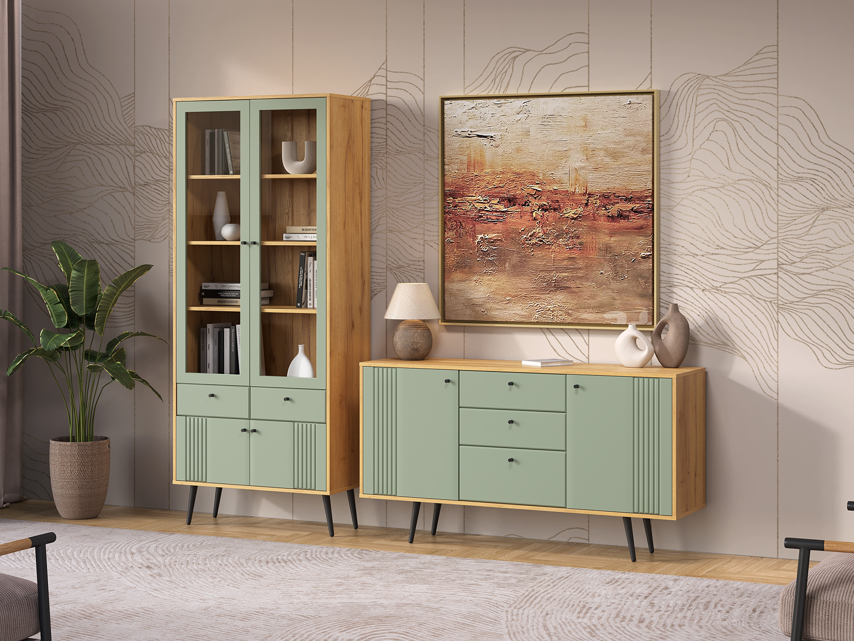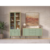Шкаф-витрина надежно защитит содержимое от пыли. Вместительный комод по функционалу не уступит полноценному шкафу. Фасады с тонкой вертикальной фрезеровкой и аккуратная фурнитура подчеркивают элегантный облик мебели.