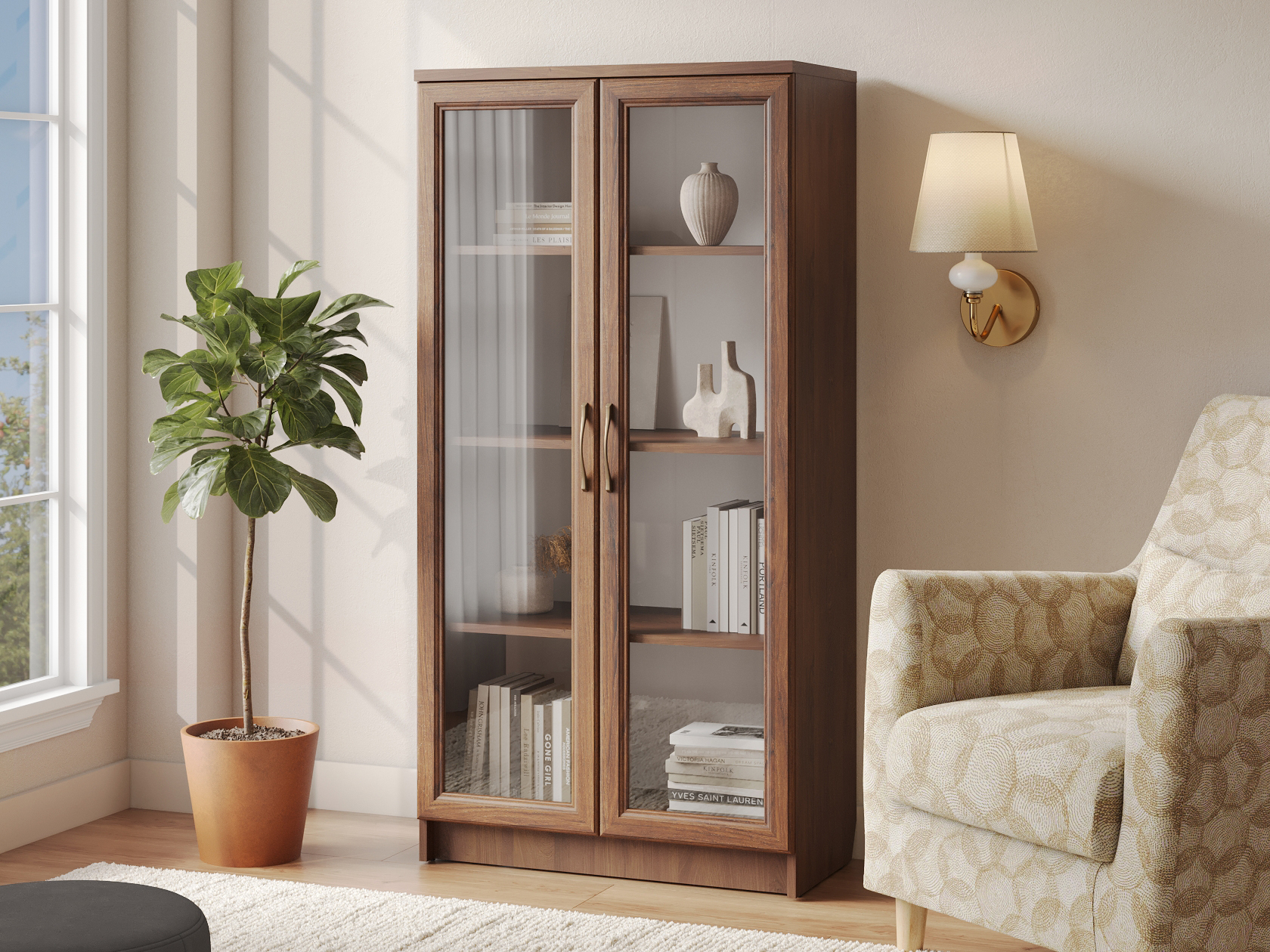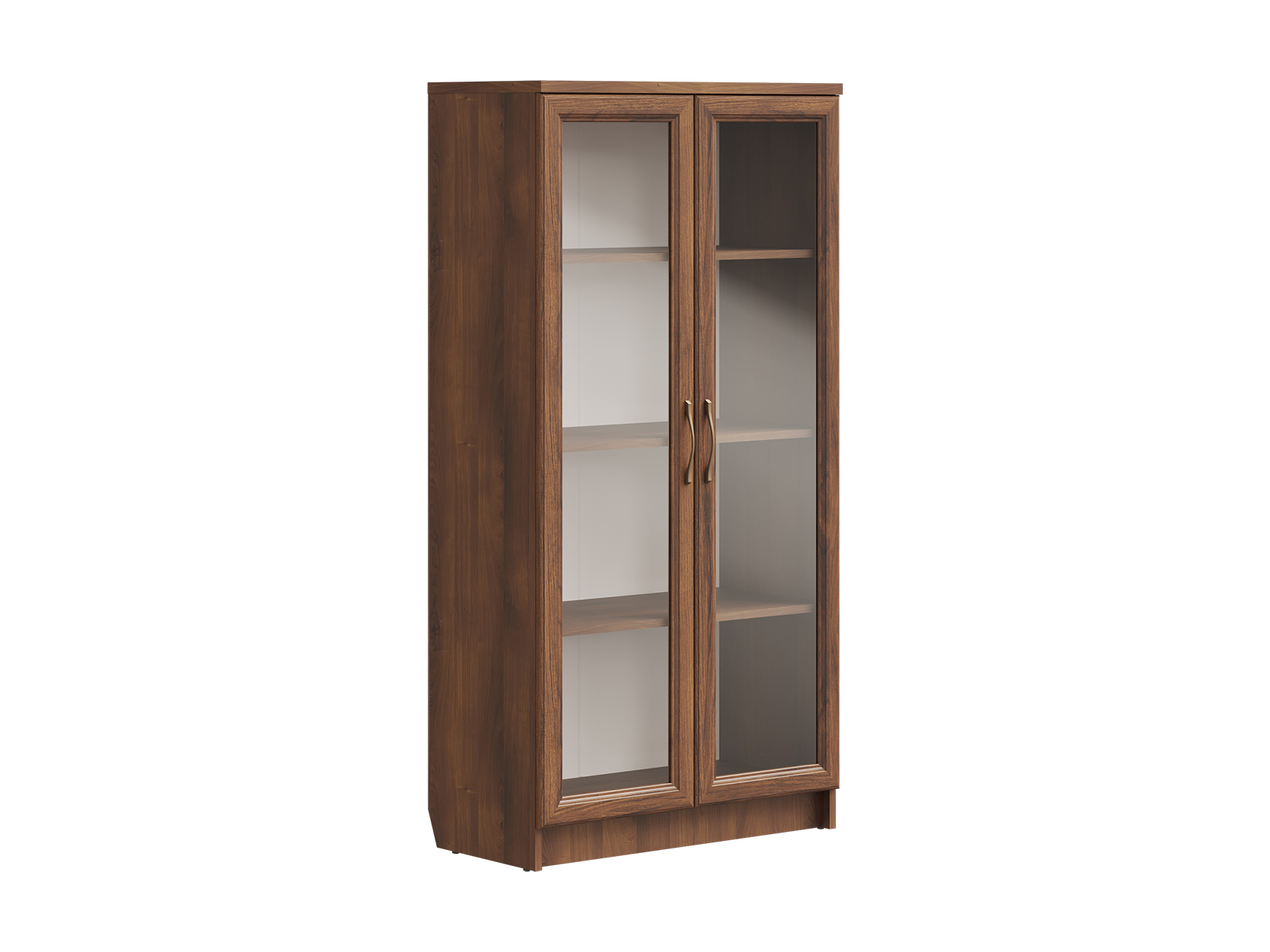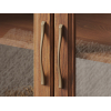 Стеклянные дверцы добавляю интерьеру легкости, при этом защищают предметы от пыли и повреждений. Элегантные бронзовые ручки сочетаются с древесной текстурой и выступают стильным акцентом обстановки.