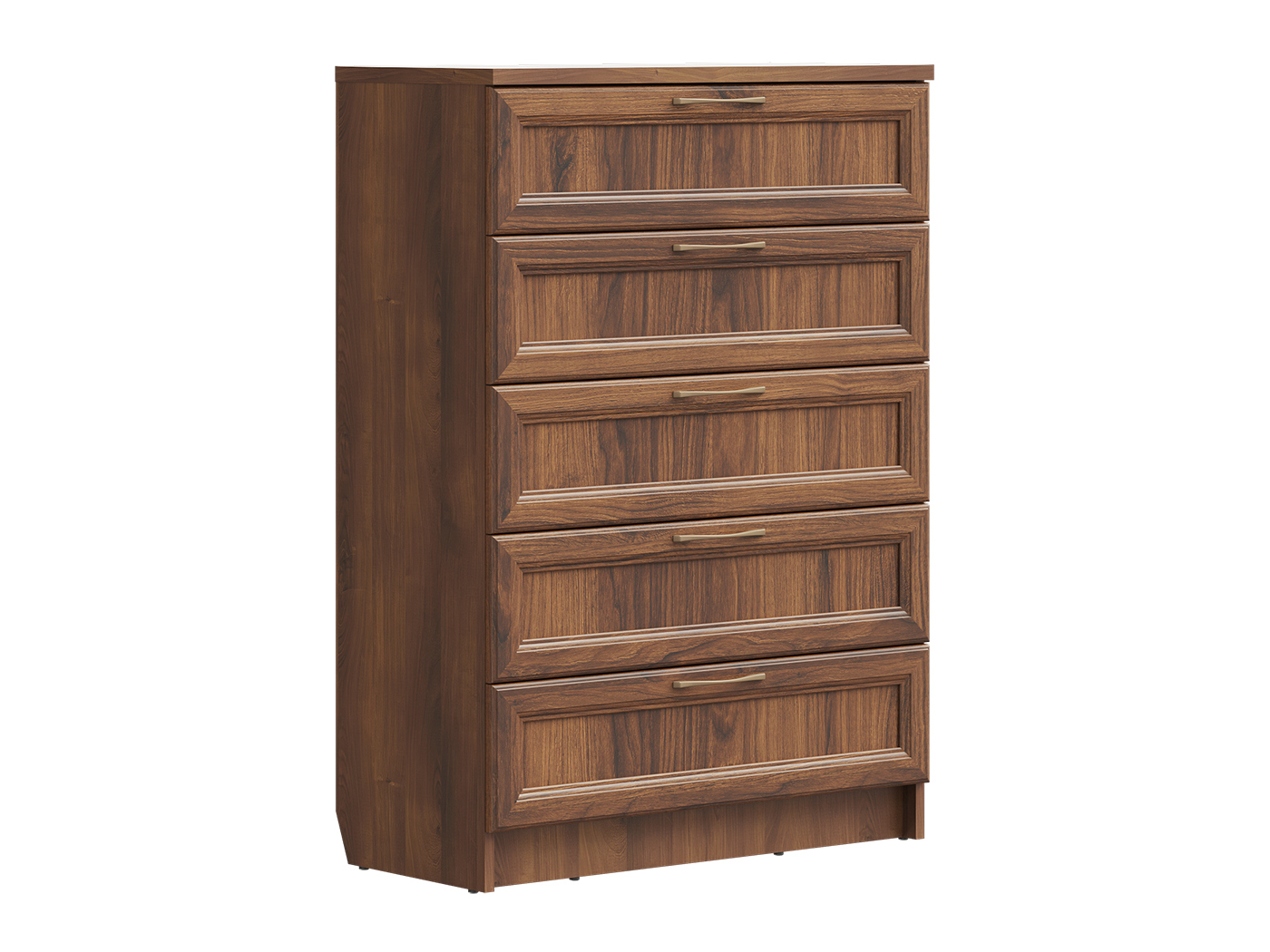 Просторные выдвижные ящики помогут рационально распределить вещи: от белья до домашнего текстиля и аксессуаров. Фасады декорированы элегантными рамками и металлическими ручками под бронзу. Текстура дерева добавляет обстановке теплоты и уюта.
