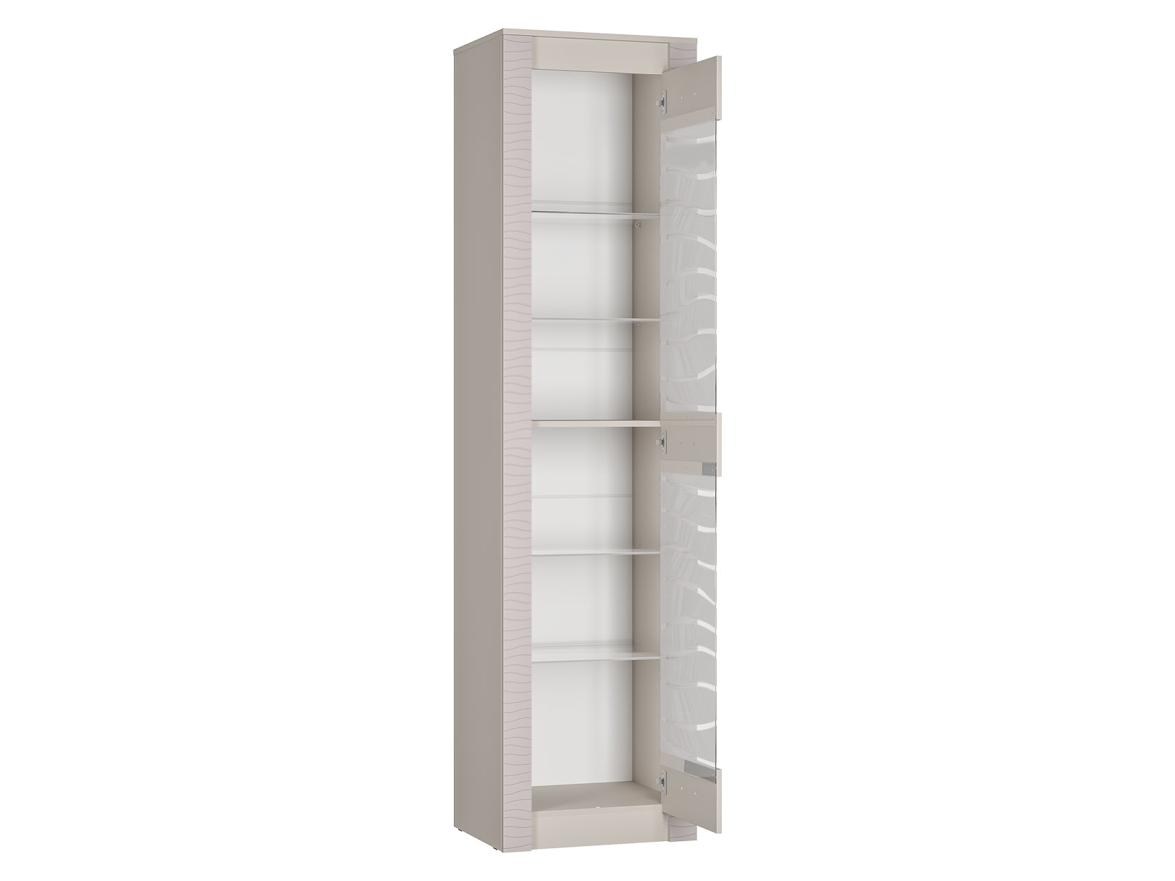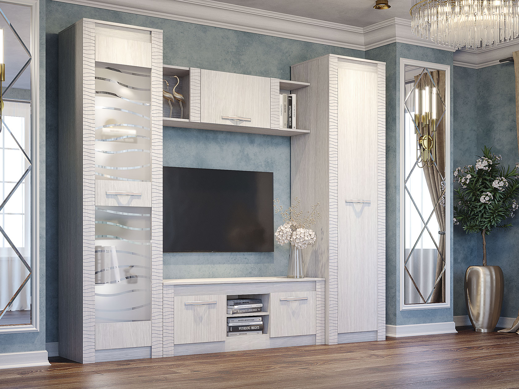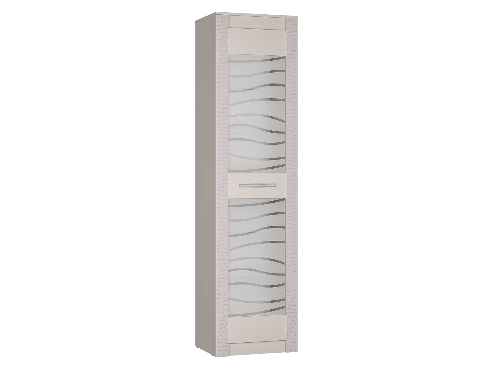 Аккуратные элементы создают симметрию в интерьере и позволяют разместить как личные предметы обихода, так и коллекционные вещи. Волнообразная фрезеровка на фасадах и матовое стекло витрины гармонично сочетаются между собой и подчеркивают индивидуальность меблировки.