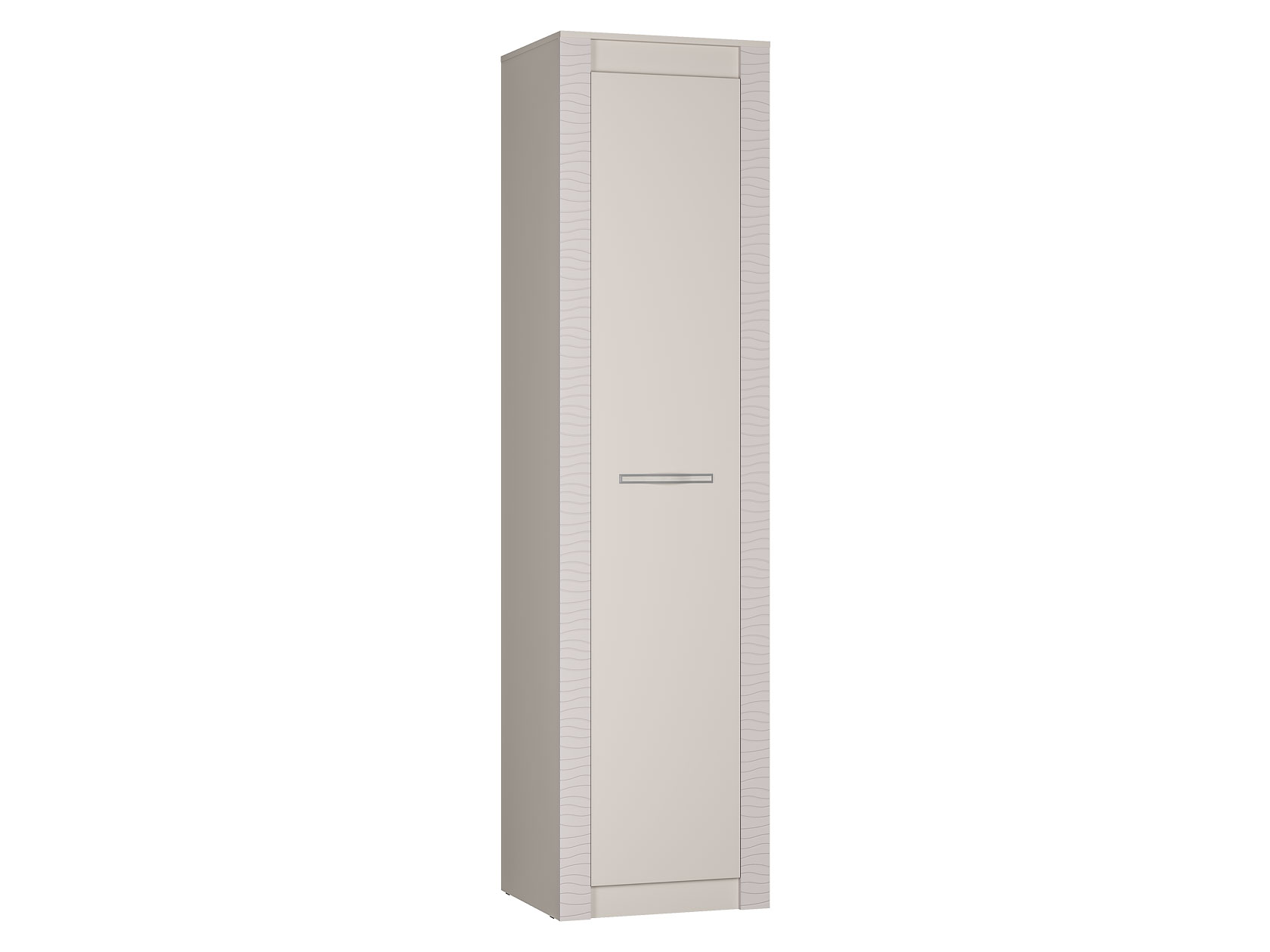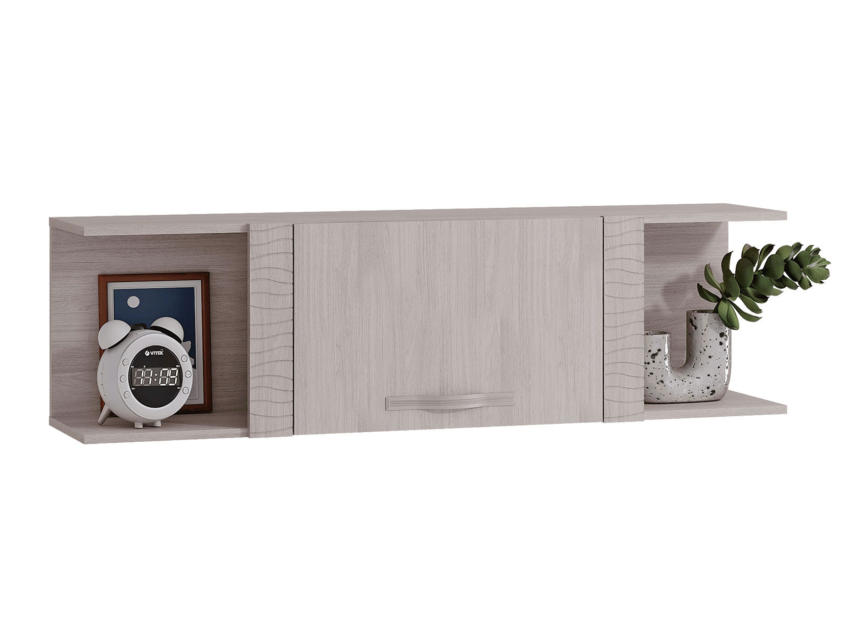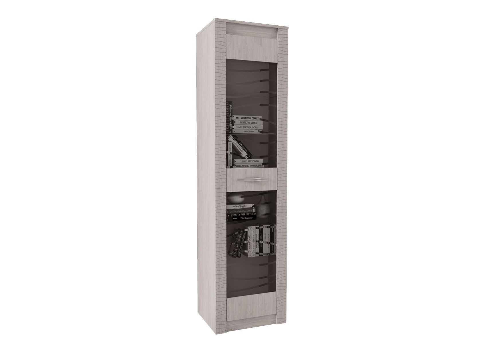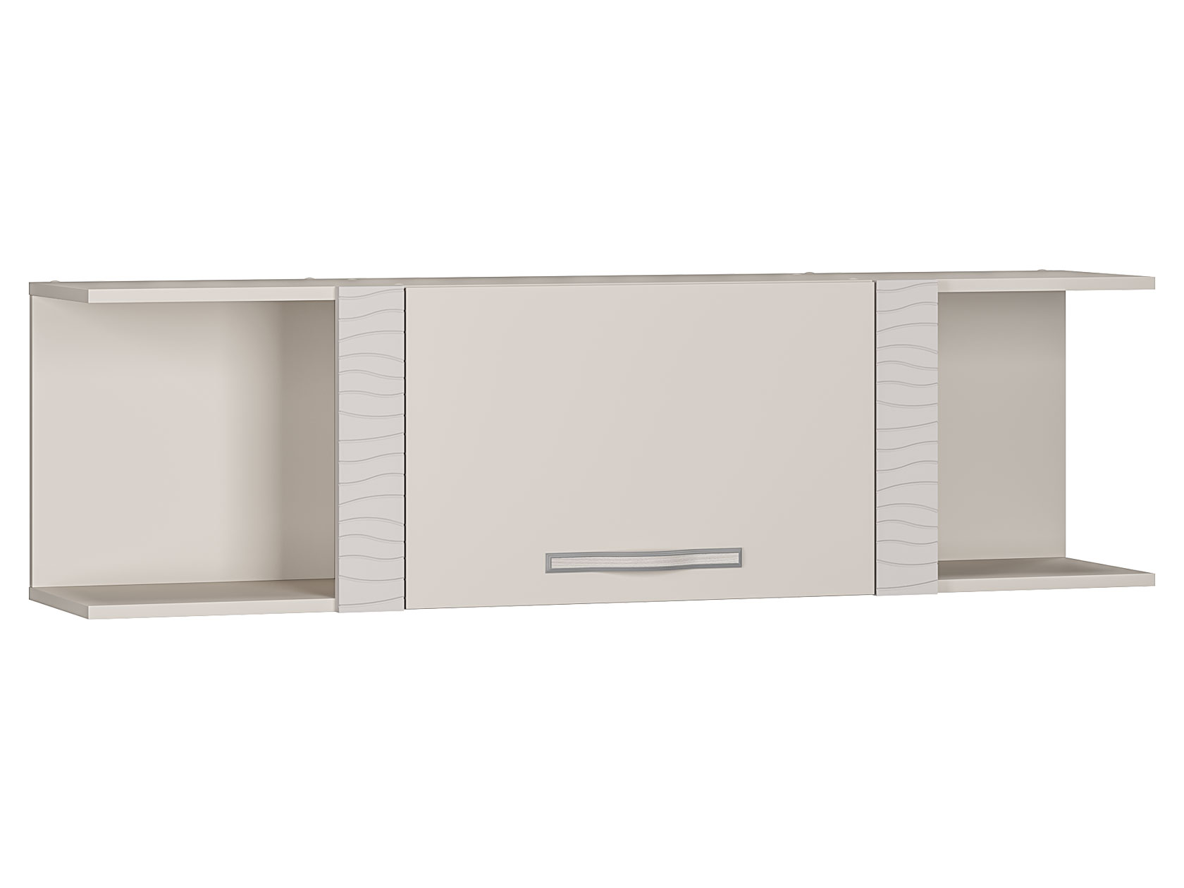 Аккуратные элементы создают симметрию в интерьере и позволяют разместить как личные предметы обихода, так и коллекционные вещи. Волнообразная фрезеровка на фасадах и матовое стекло витрины гармонично сочетаются между собой и подчеркивают индивидуальность меблировки.