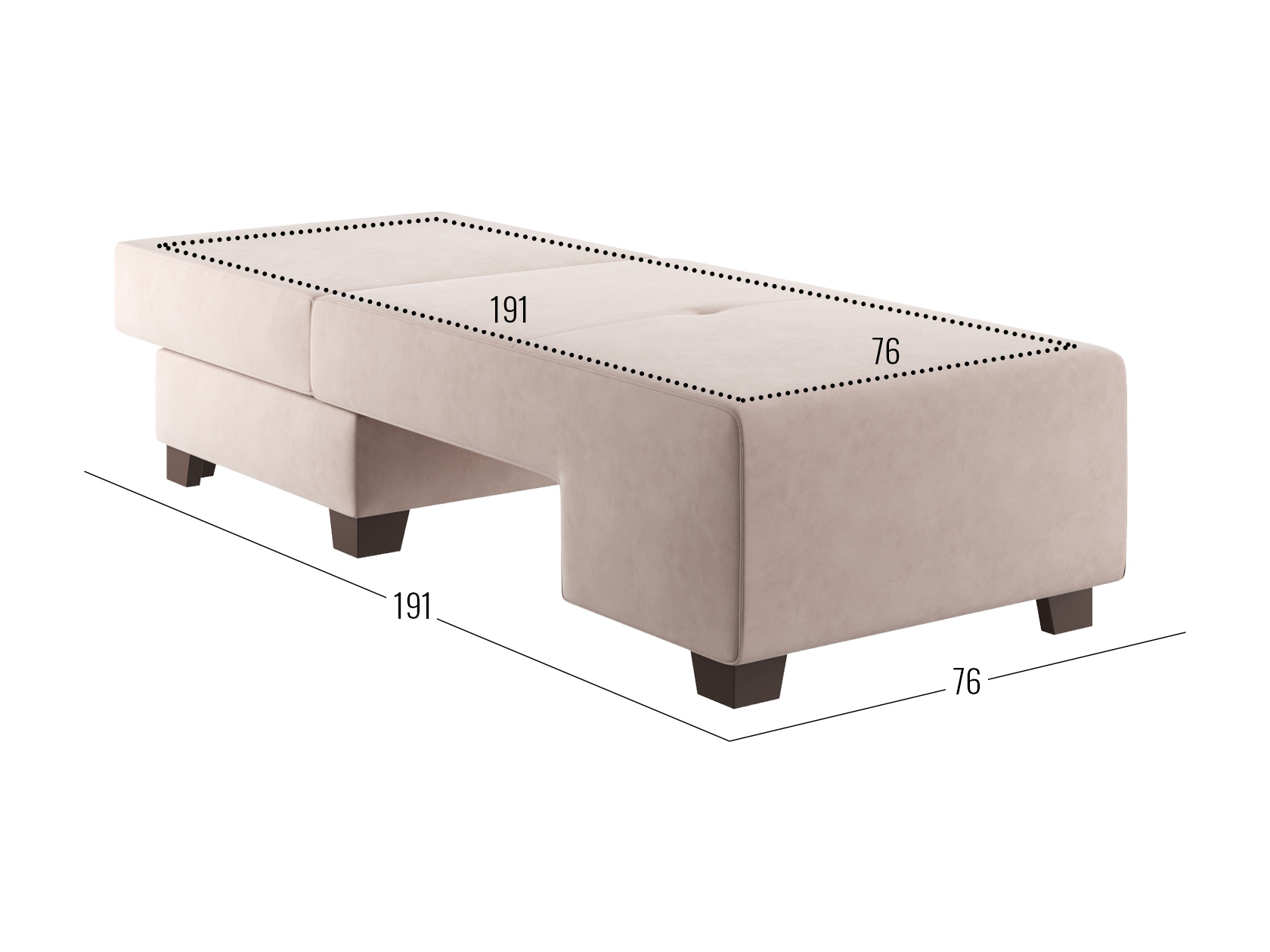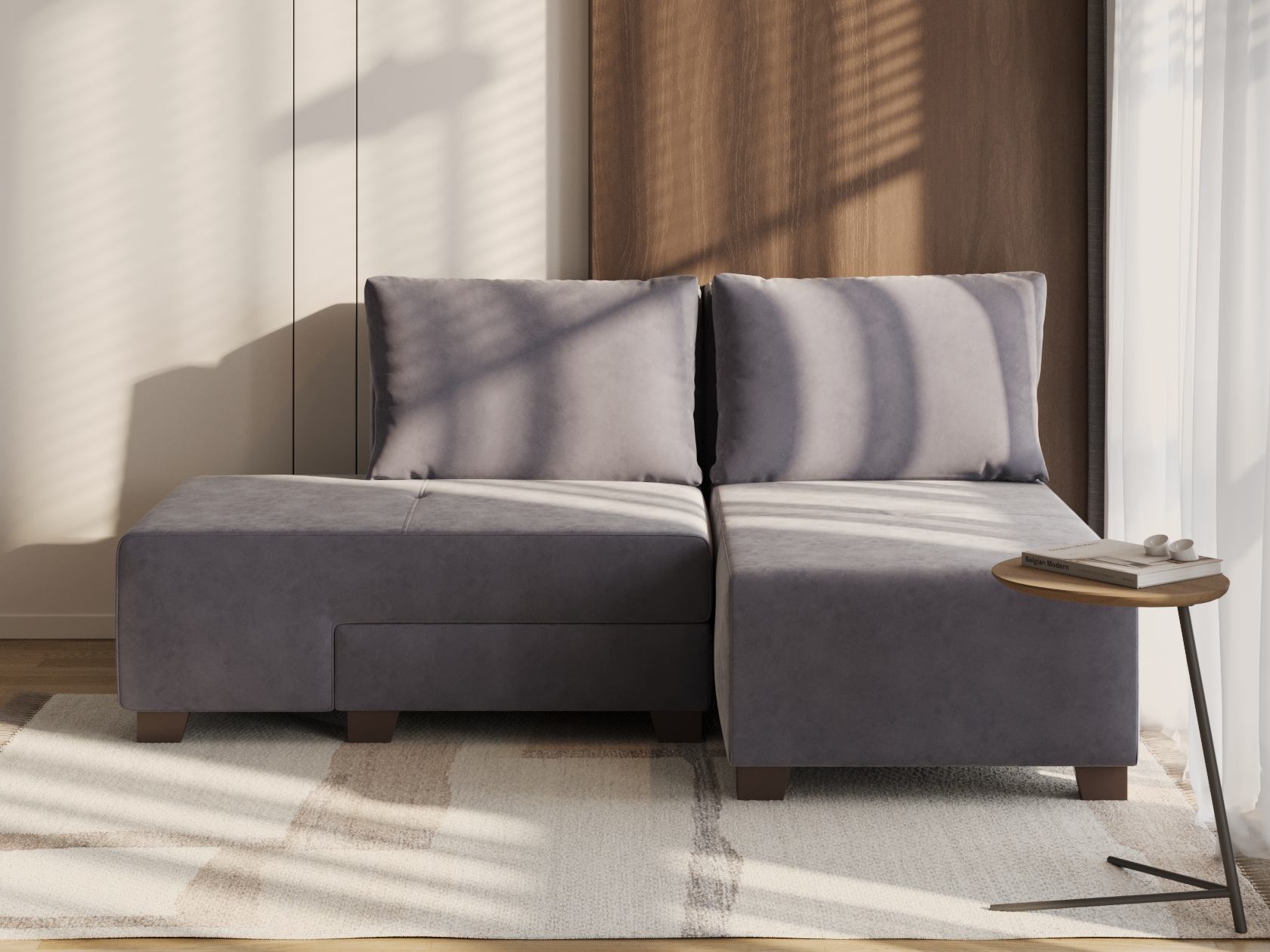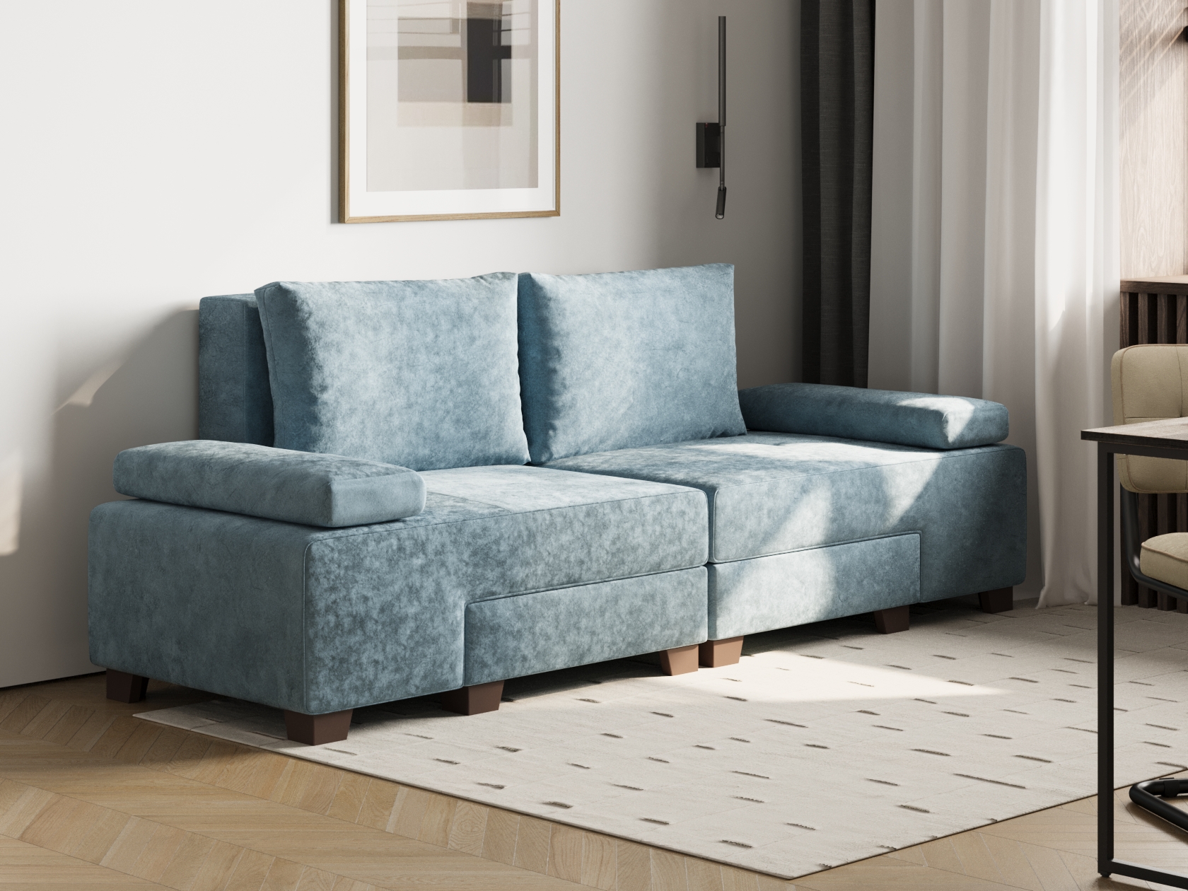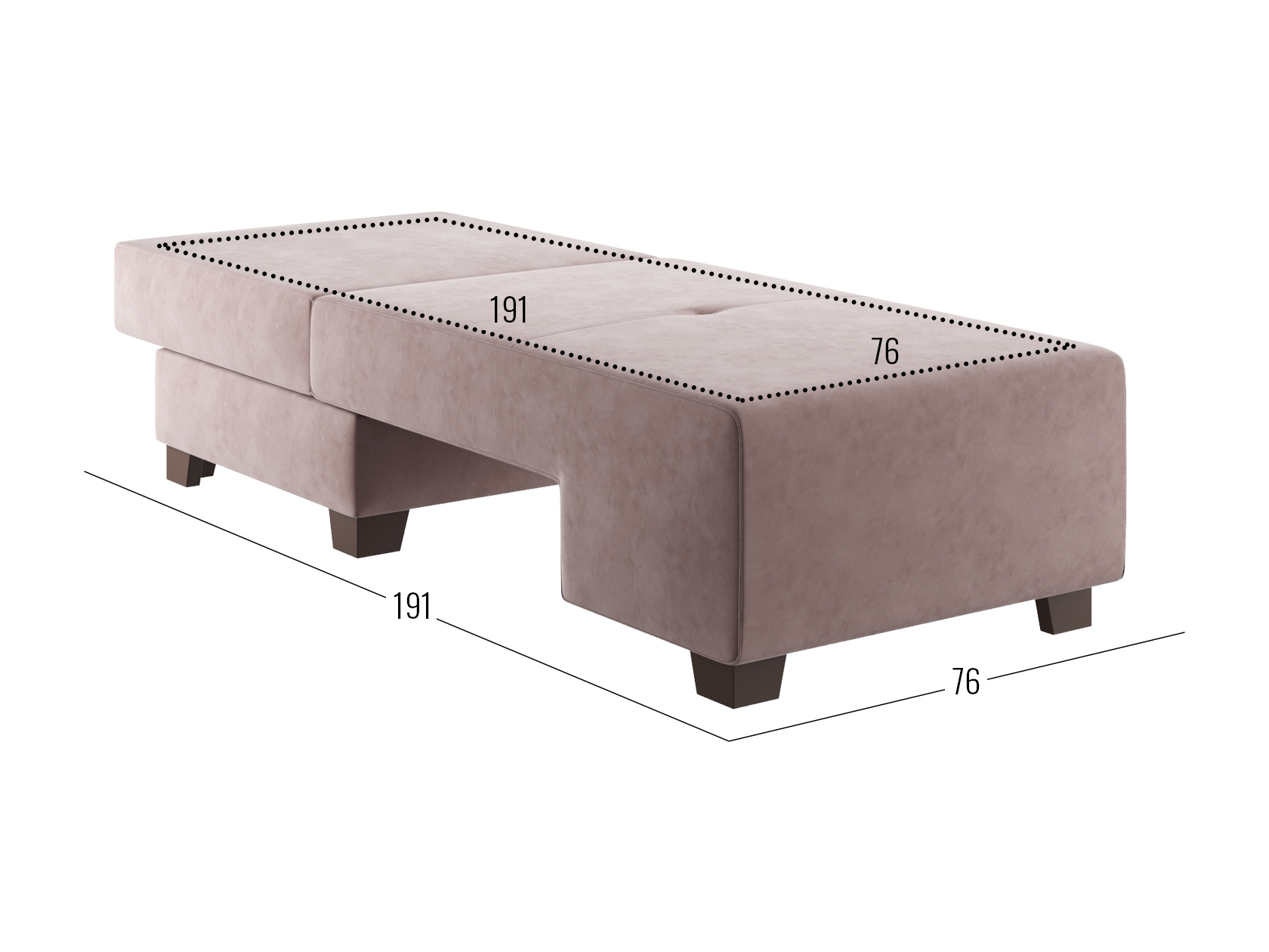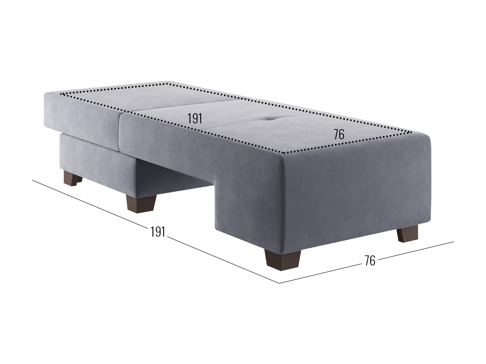 В сложенном виде модель отлично подходит для небольшой комнаты. Сиденье легко раскладывается и образует спальное место для одного человека. Невысокие ножки создают стильный акцент в интерьере. Практичный бельевой короб — важное преимущество конструкции.
