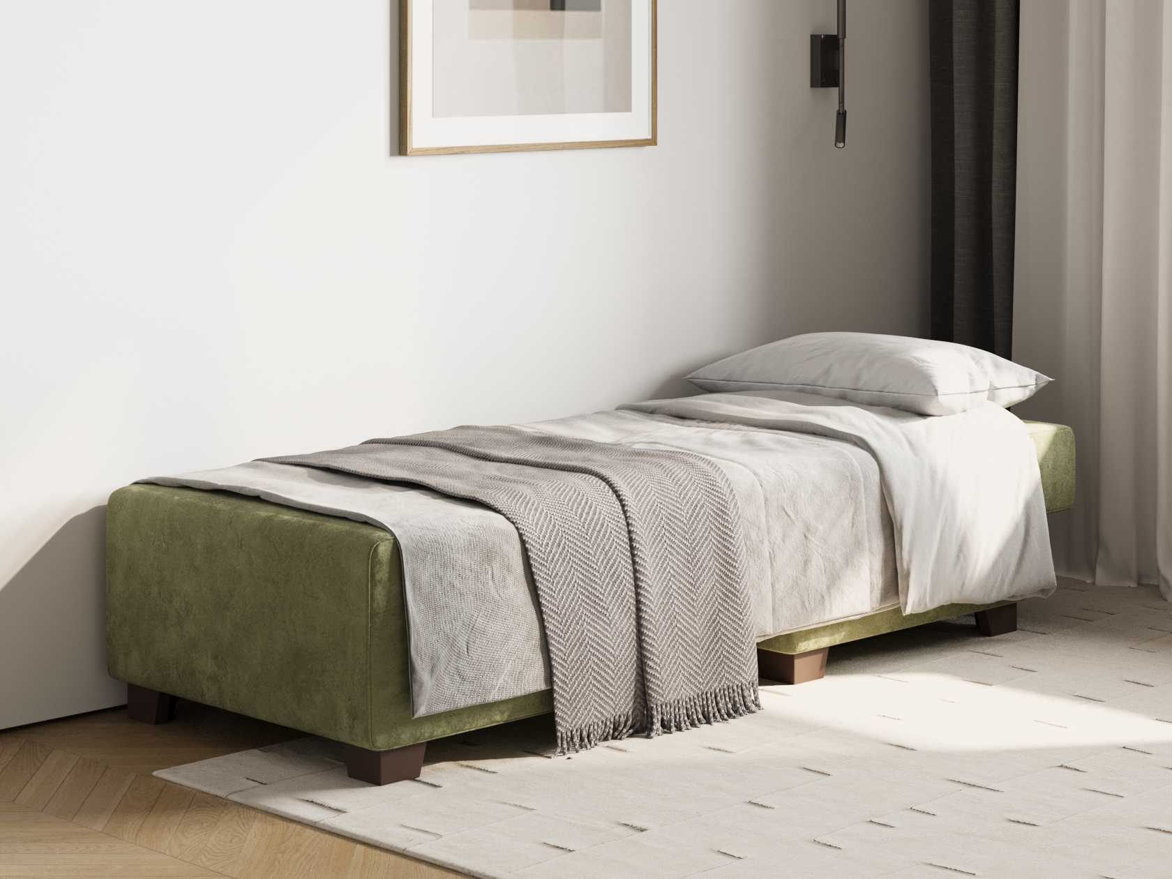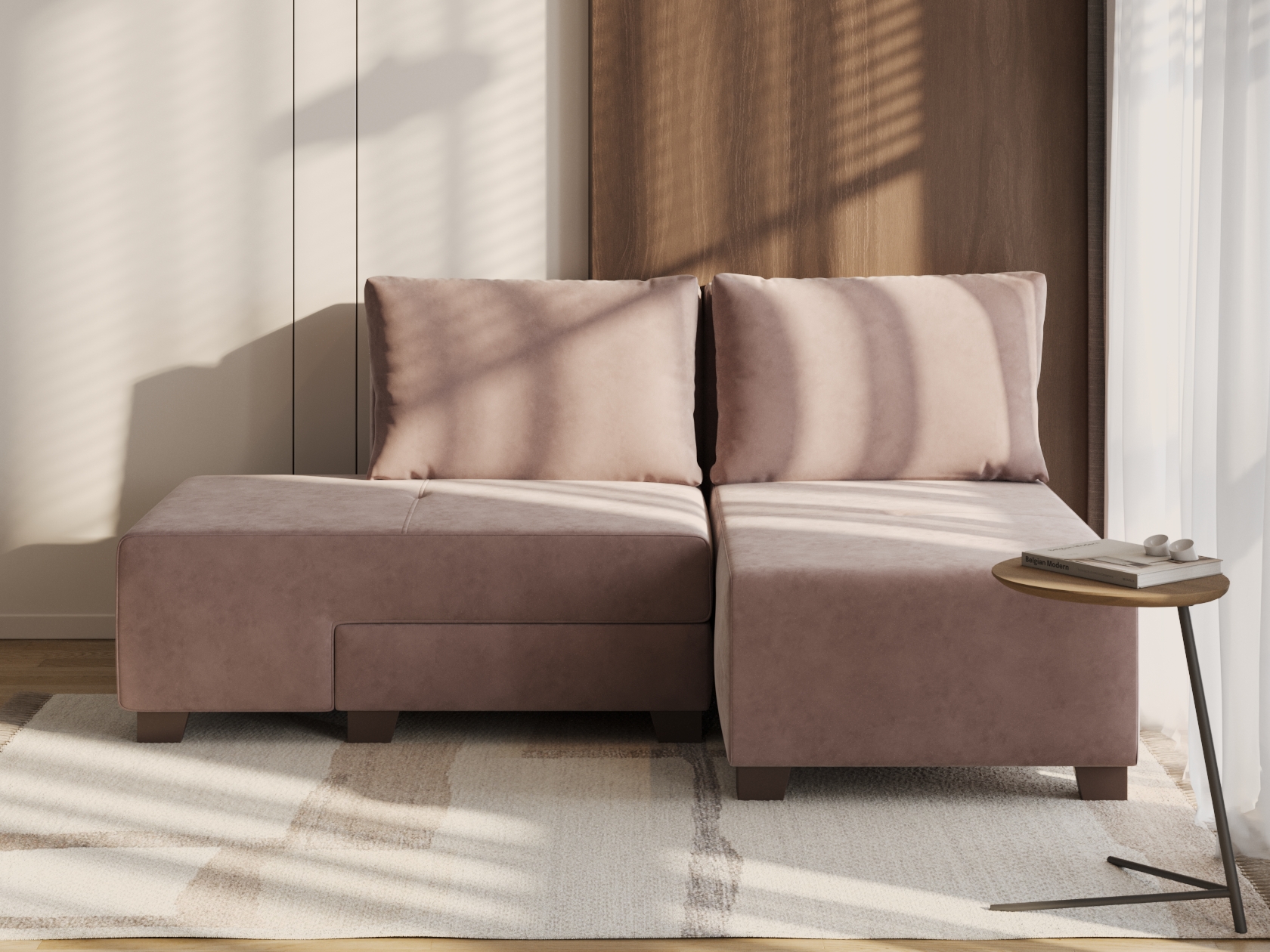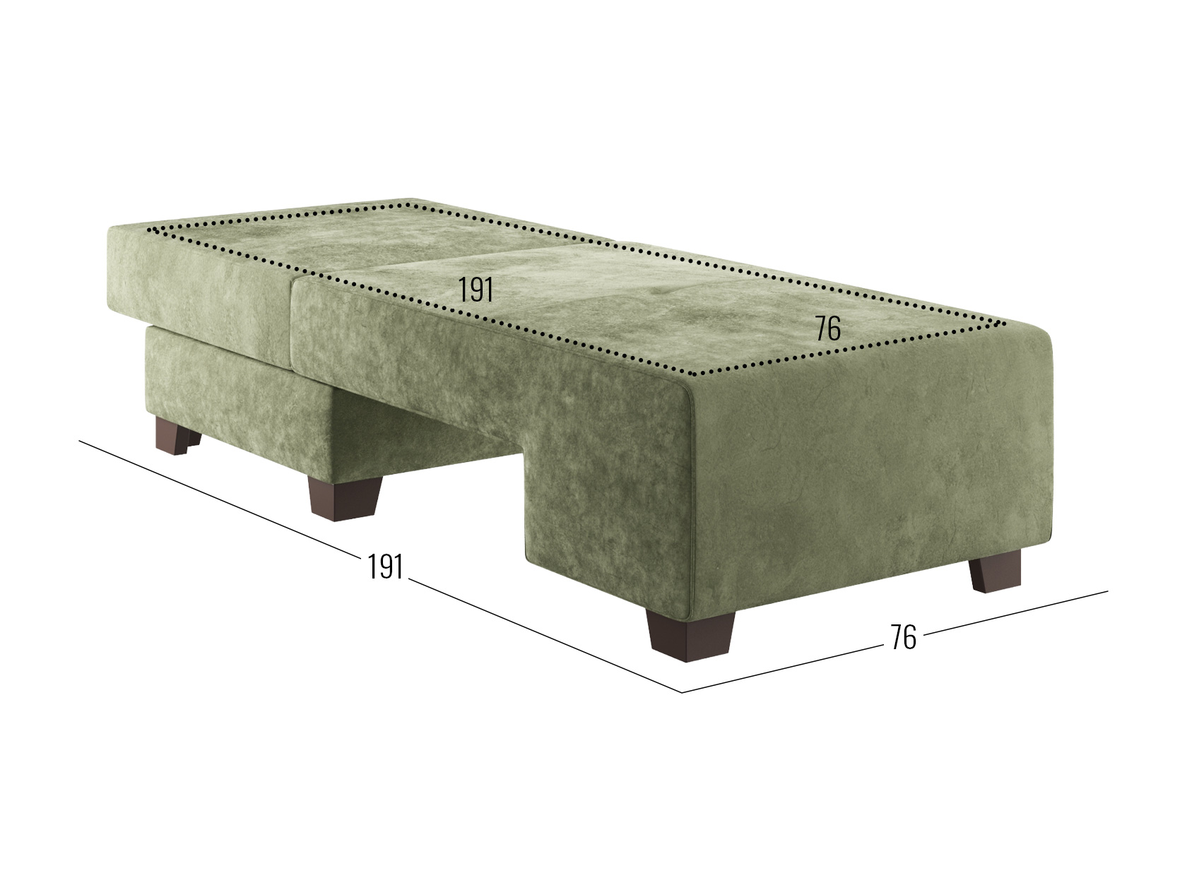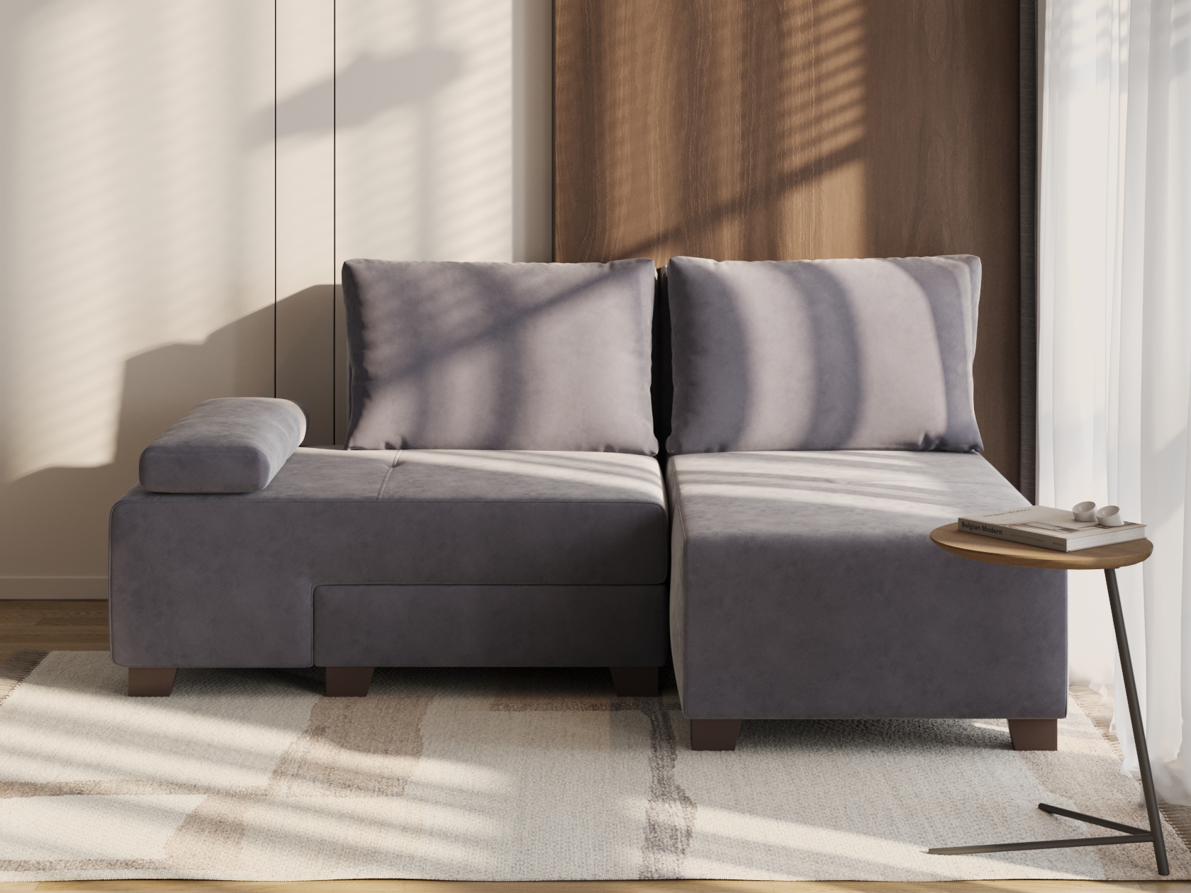 В сложенном виде модель отлично подходит для небольшой комнаты. Сиденье легко раскладывается и образует спальное место для одного человека. Невысокие ножки создают стильный акцент в интерьере. Практичный бельевой короб — важное преимущество конструкции.