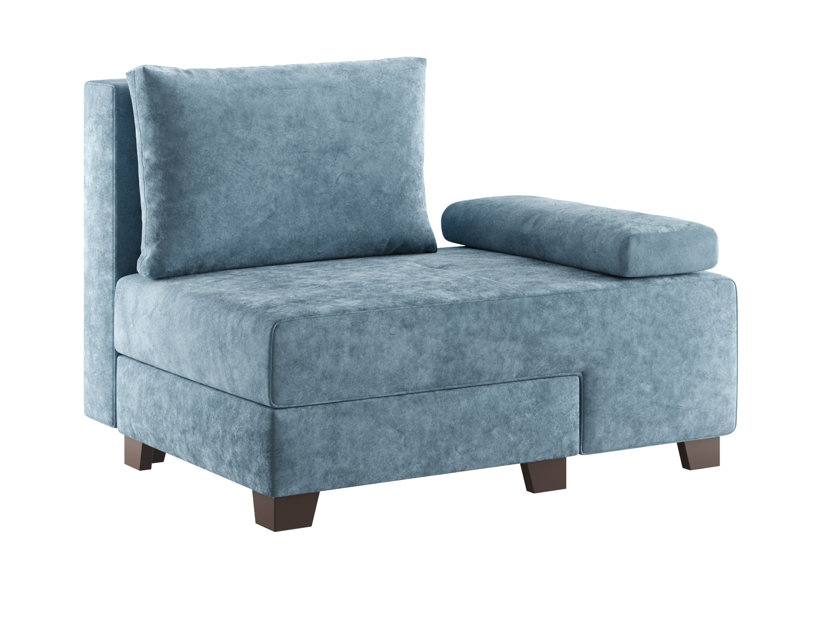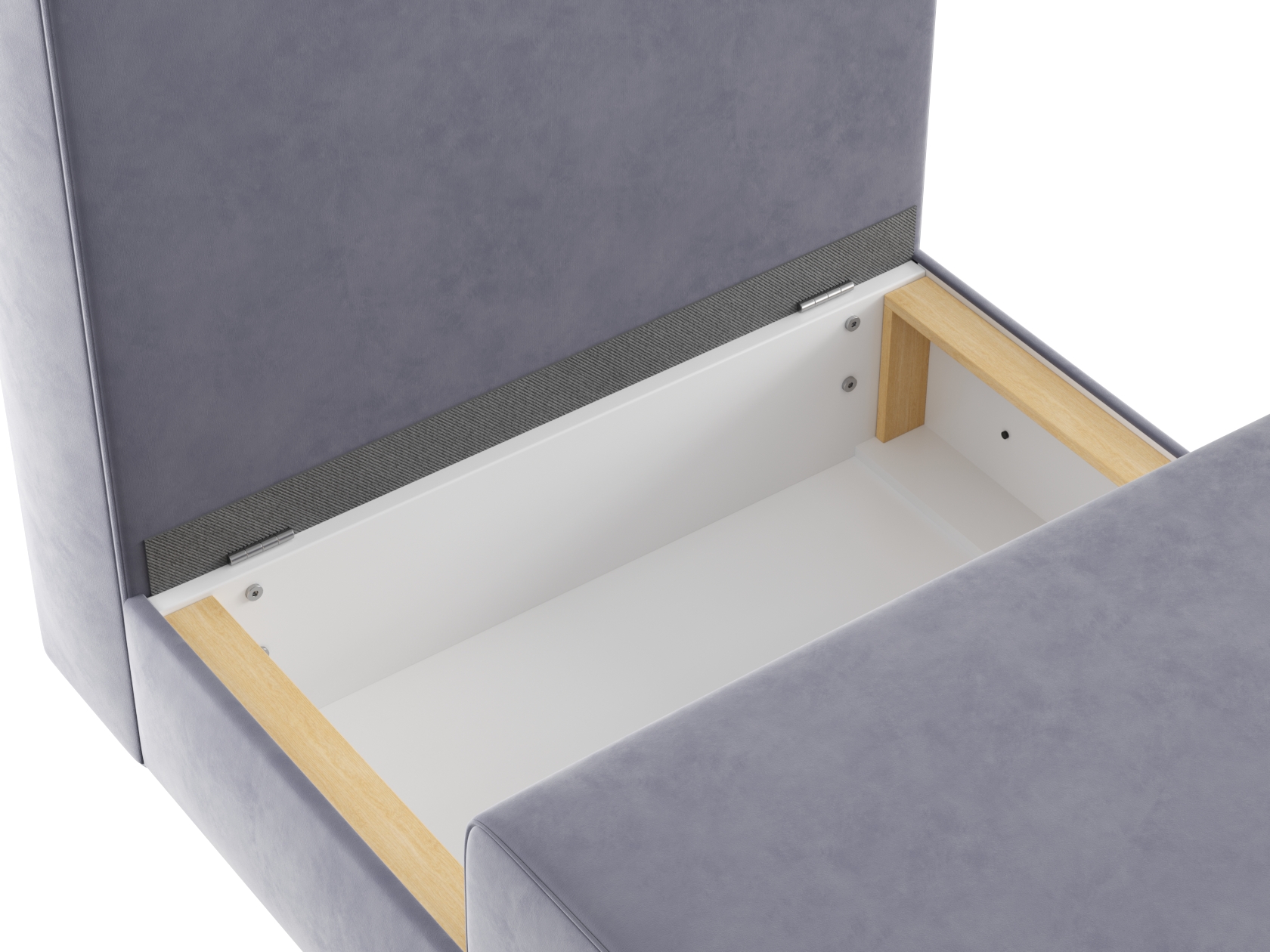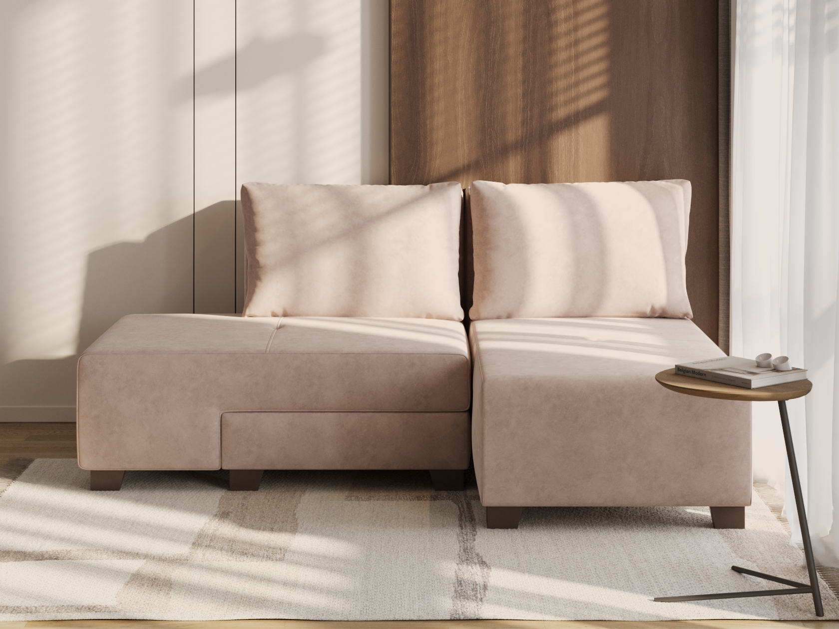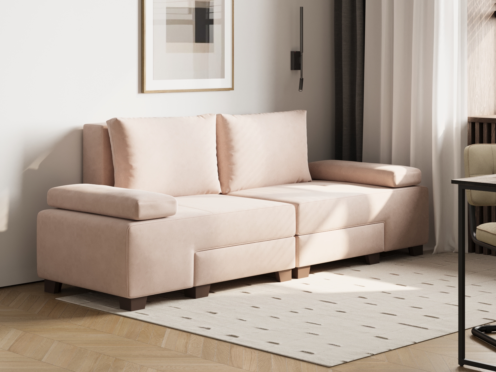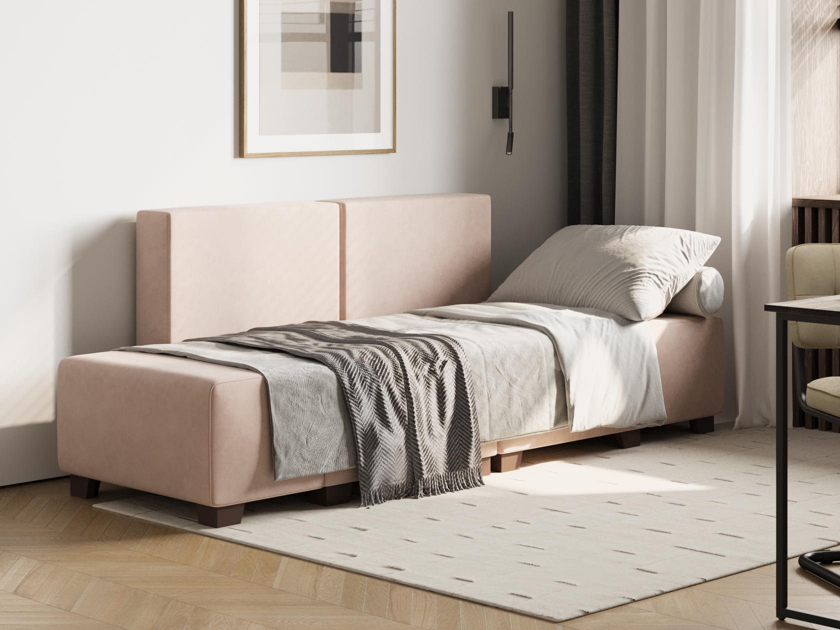 В сложенном виде модель отлично подходит для небольшой комнаты. Сиденье легко раскладывается и образует спальное место для одного человека. Невысокие ножки создают стильный акцент в интерьере. Практичный бельевой короб — важное преимущество конструкции.