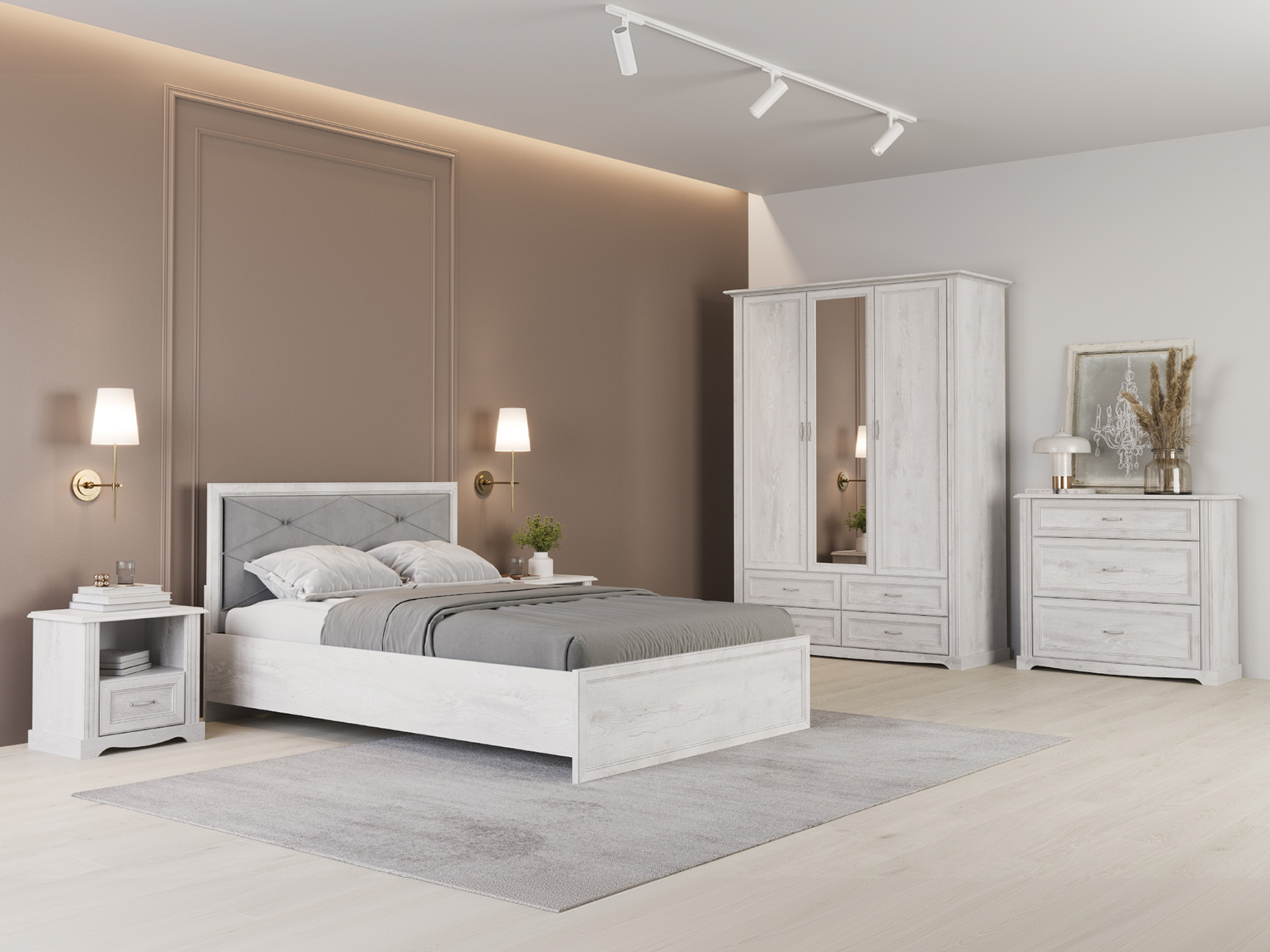 Комбинированное наполнение позволяет удобно расположить предметы, которые часто нужны перед сном и после пробуждения. Элегантный рамочный фасад сочетается с древесной текстурой, придавая мебели благородный облик.