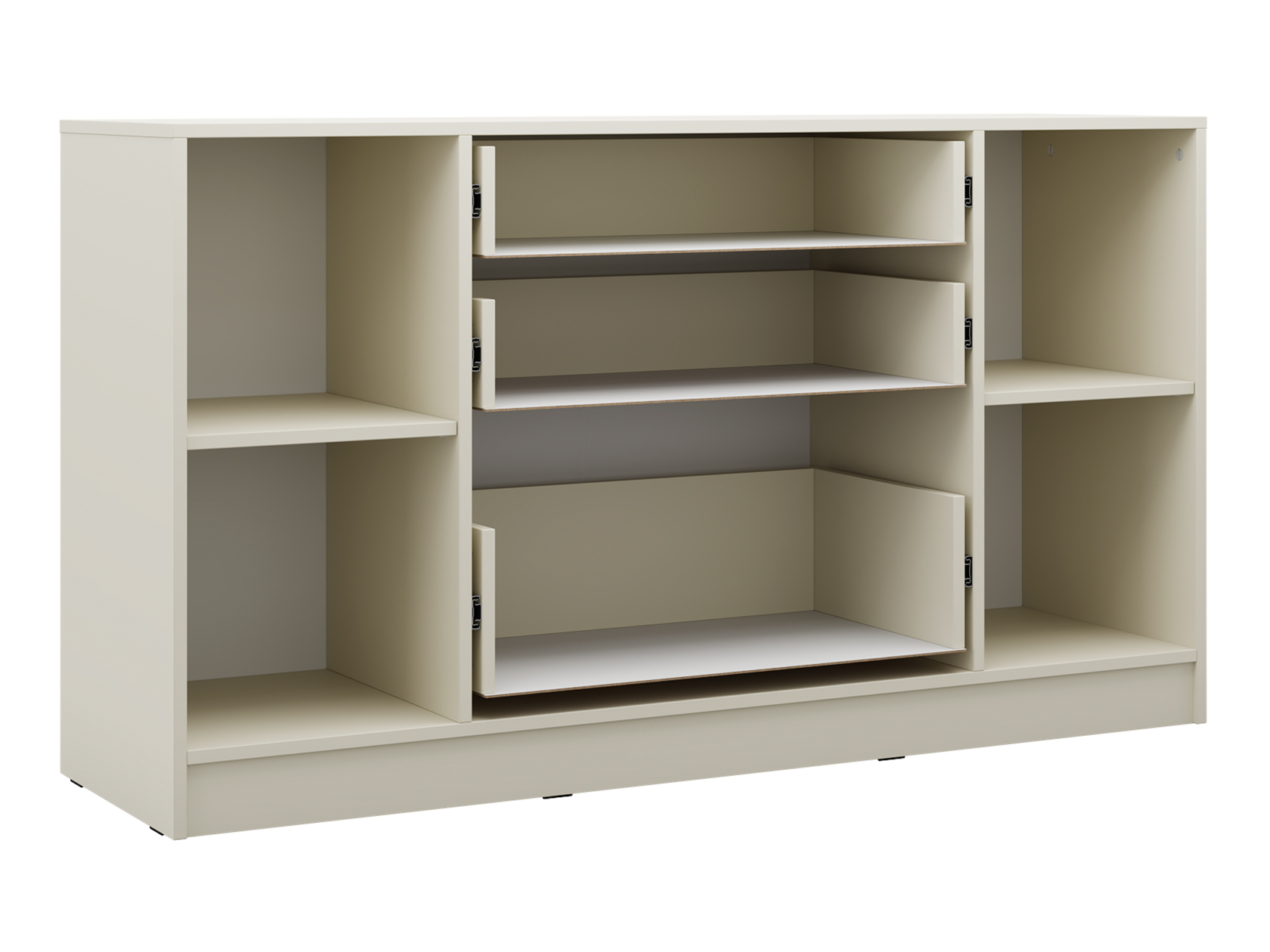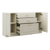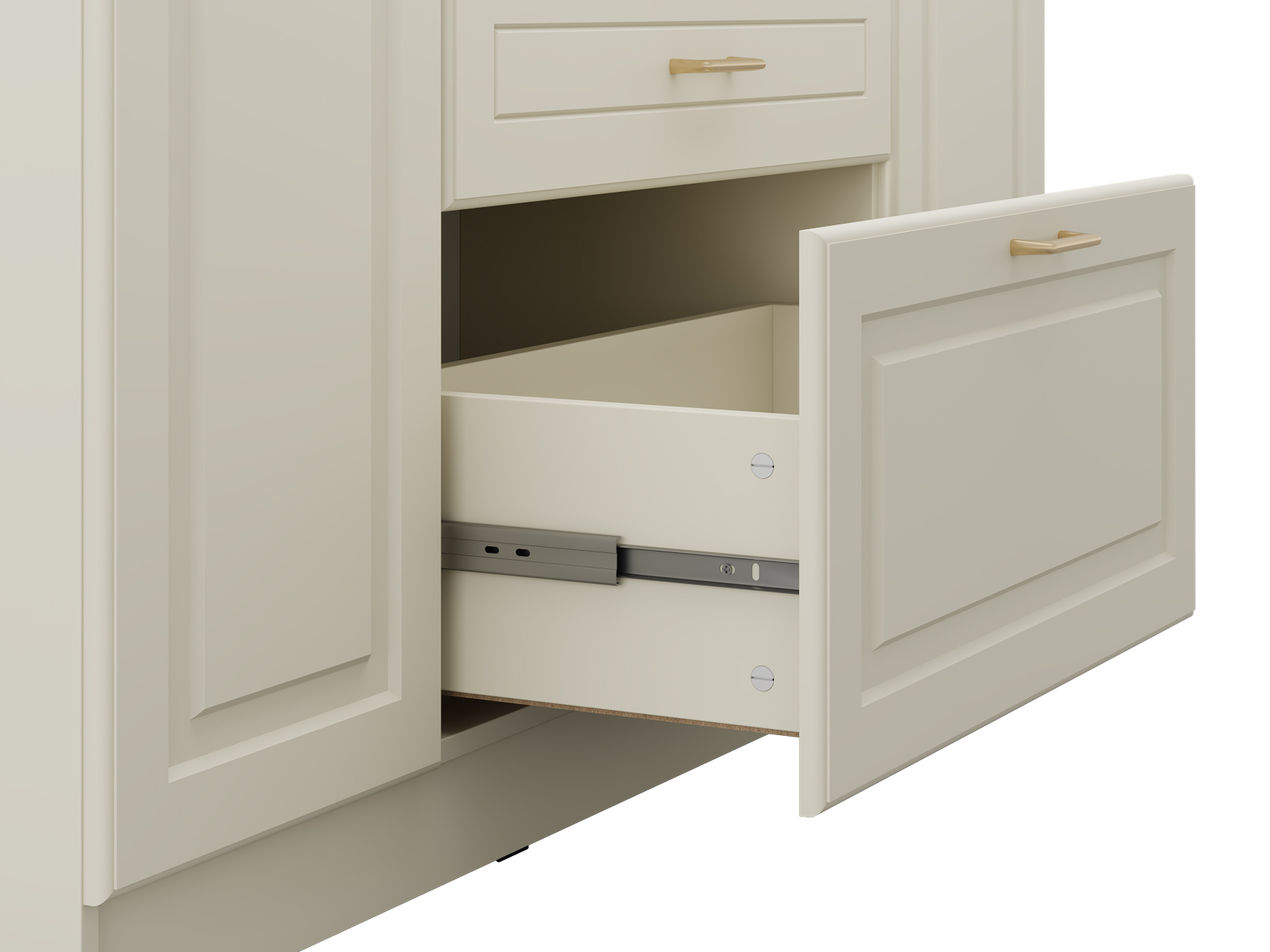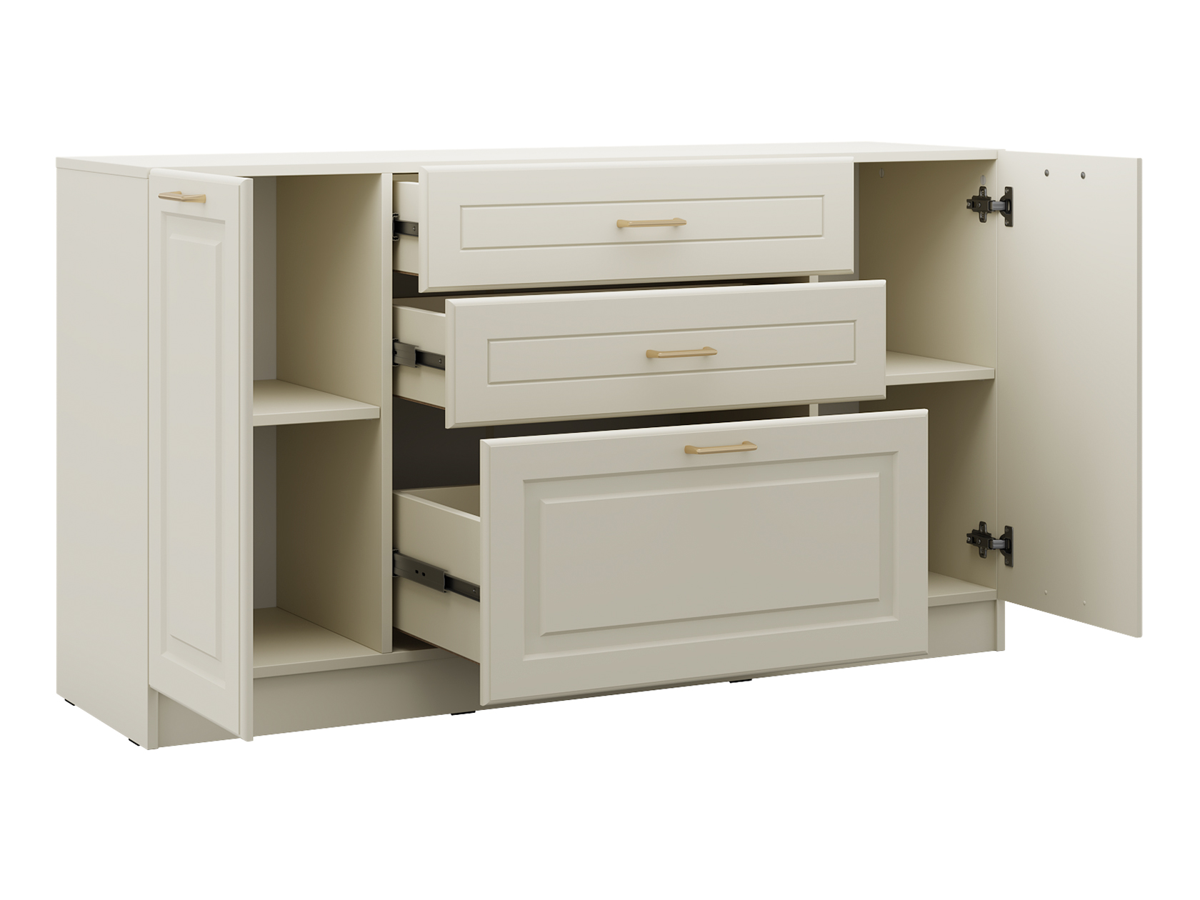 Выдвижные ящики позволяют аккуратно разложить содержимое по категориям и быстро находить нужную вещь даже в спешке. Полки за распашными дверцами обеспечат место для более объемных предметов. Рамочный декор на фасадах придает мебели элегантный вид.