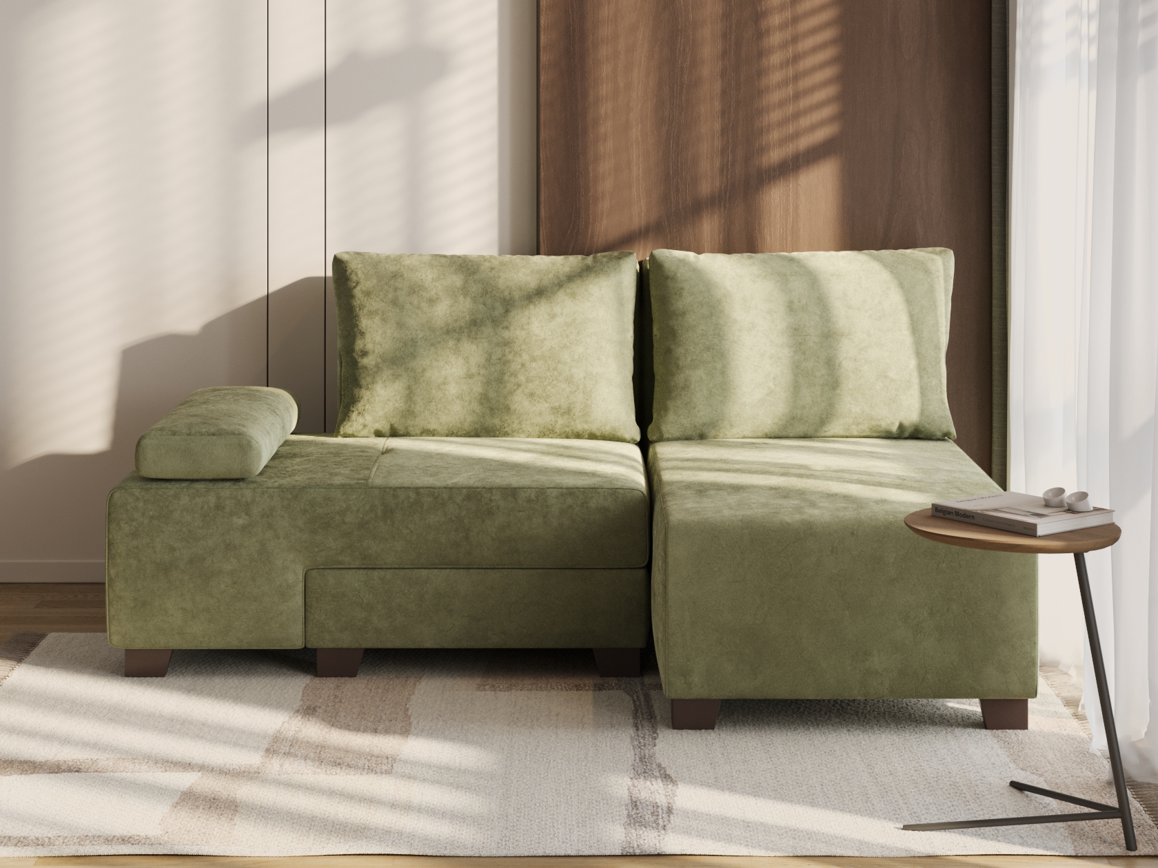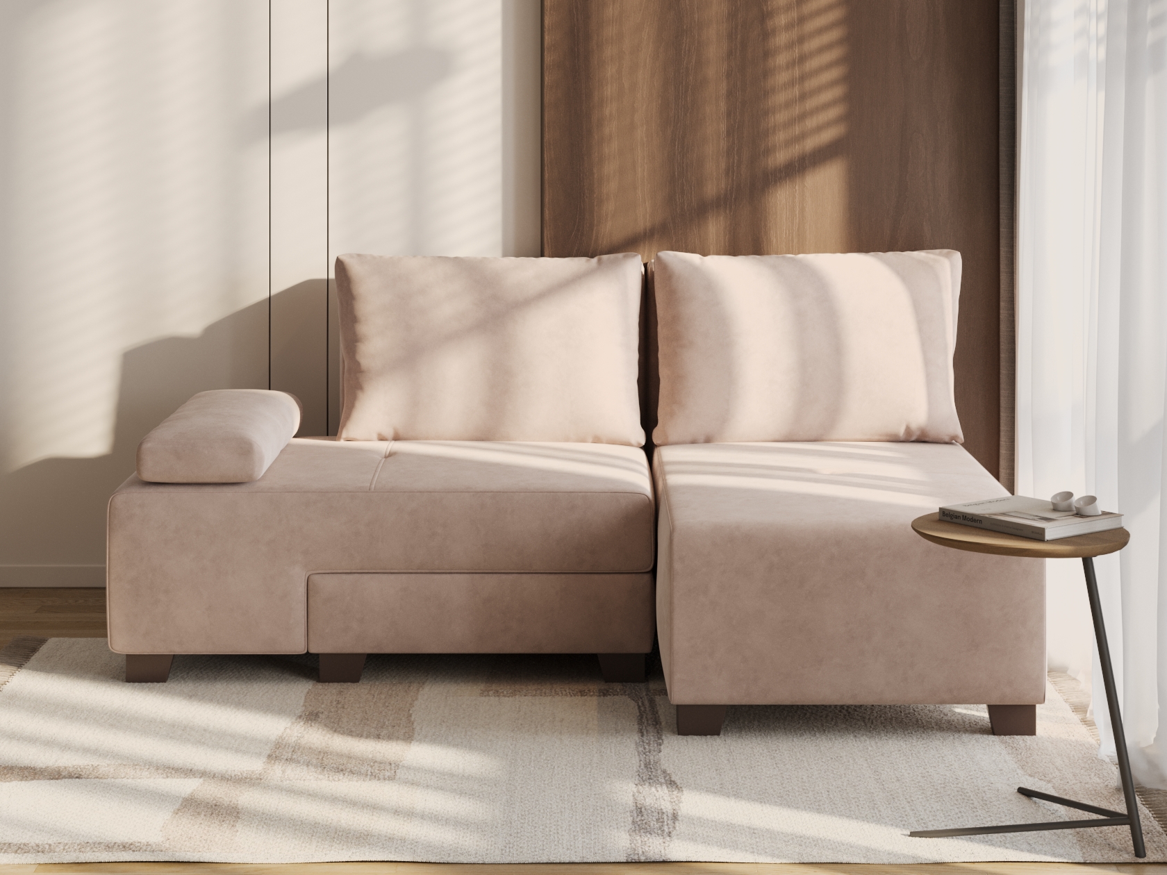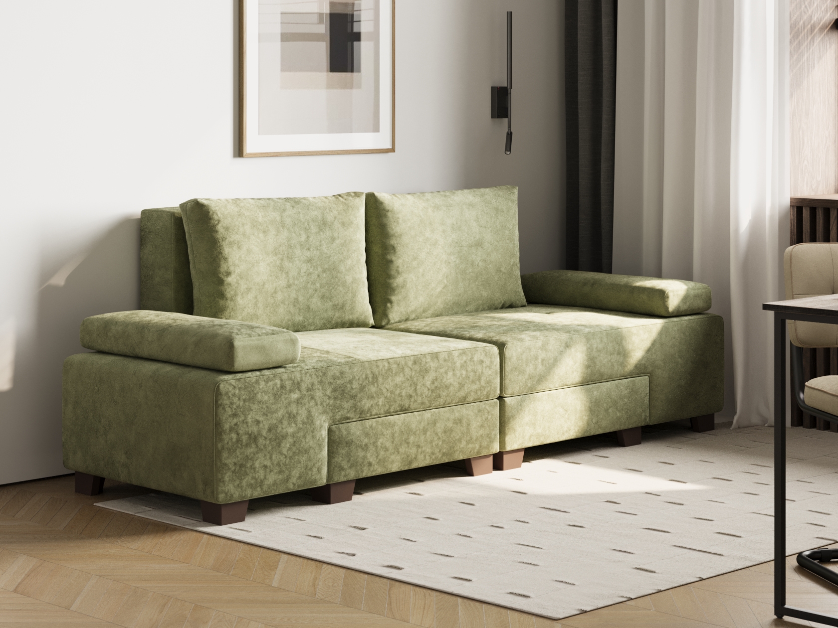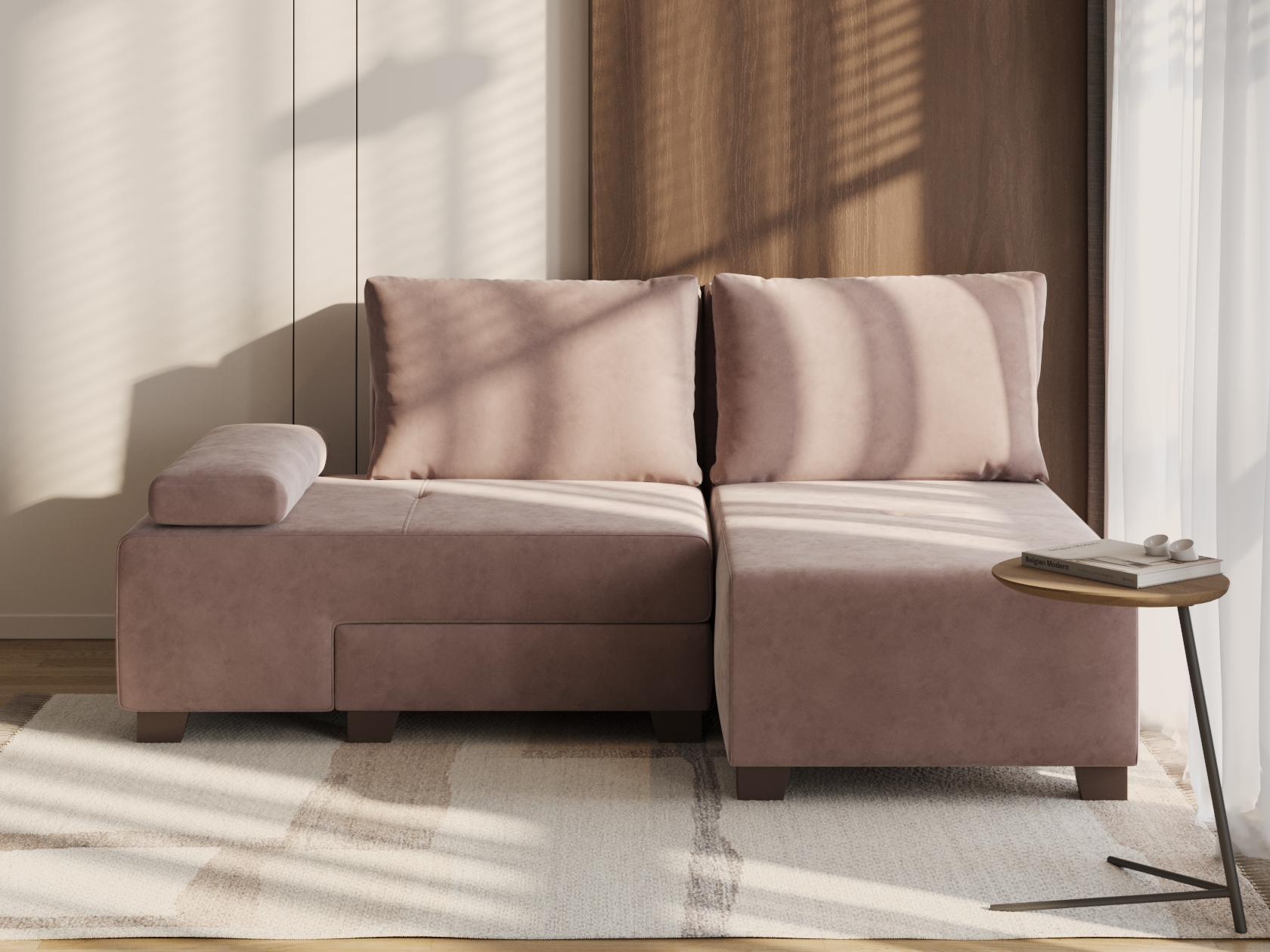 При раскладывании образуется большое спальное место, поэтому диван идеально подходит для отдыха и сна. Подушки, имитирующие подлокотники, добавляют мебели комфорт и удобство. Обивка из приятной на ощупь ткани создает уютную атмосферу, а небольшие ножки служат стильными акцентами интерьера.