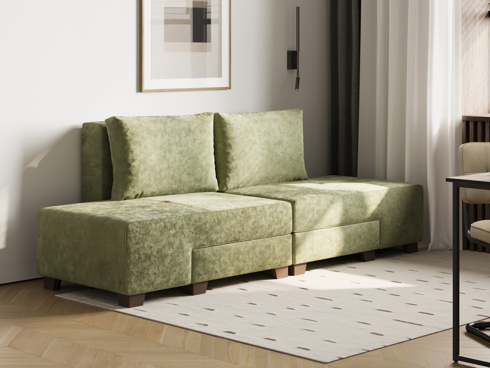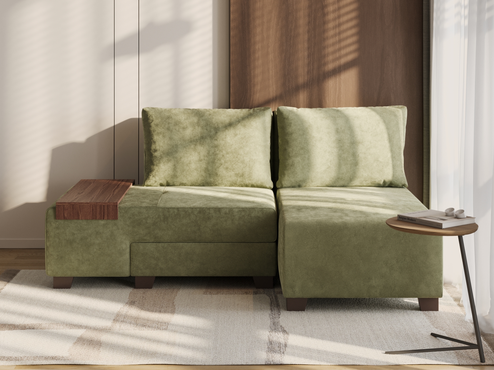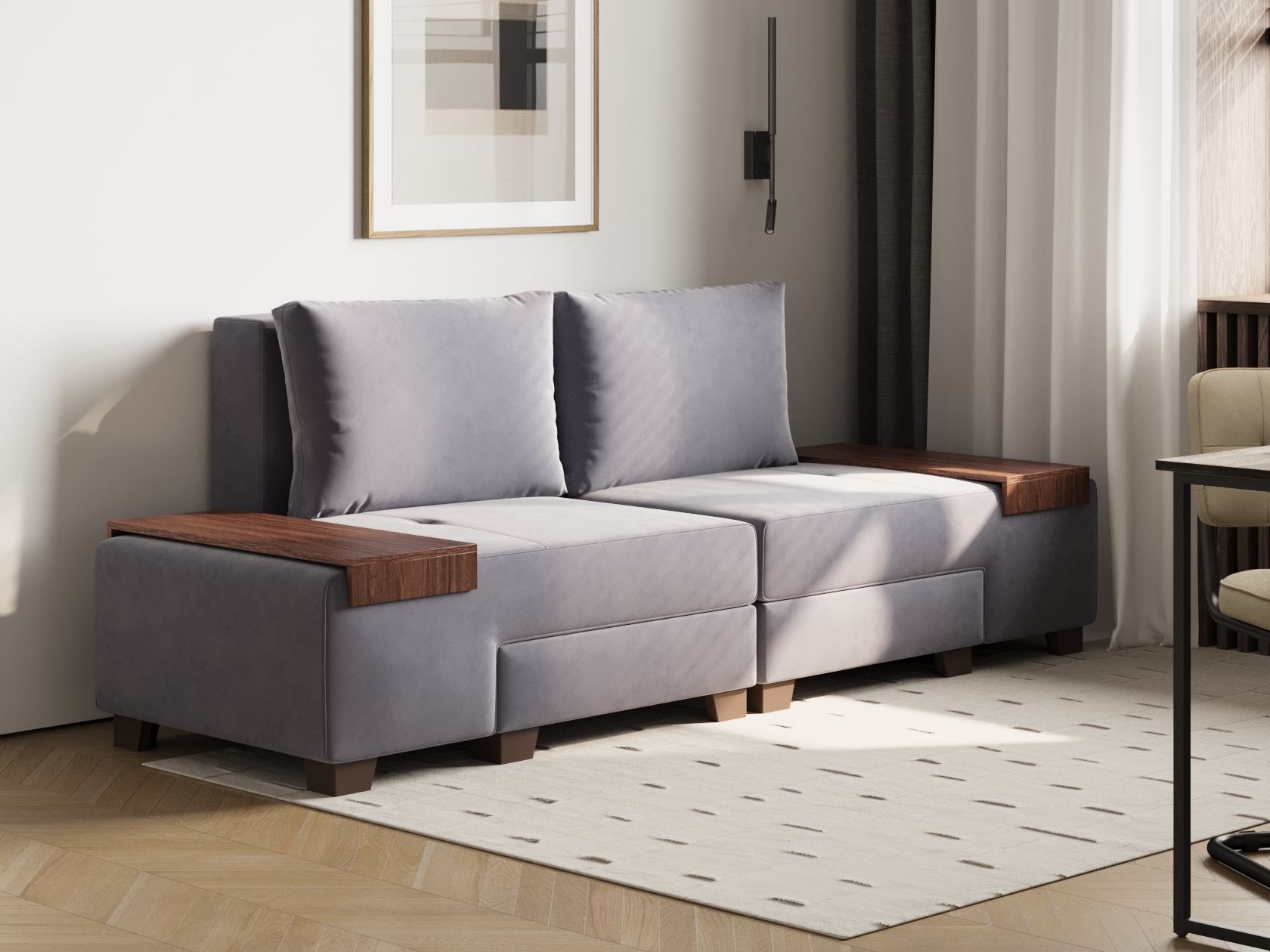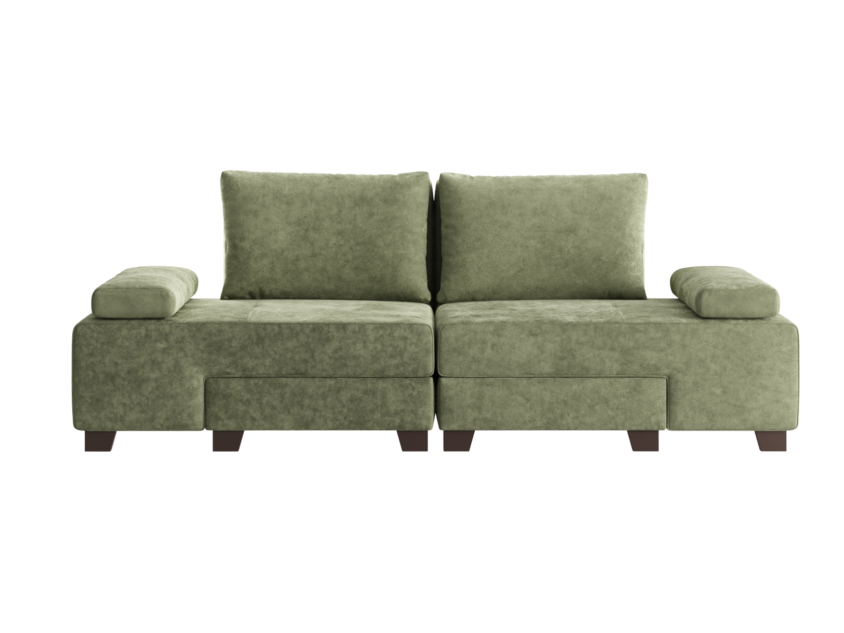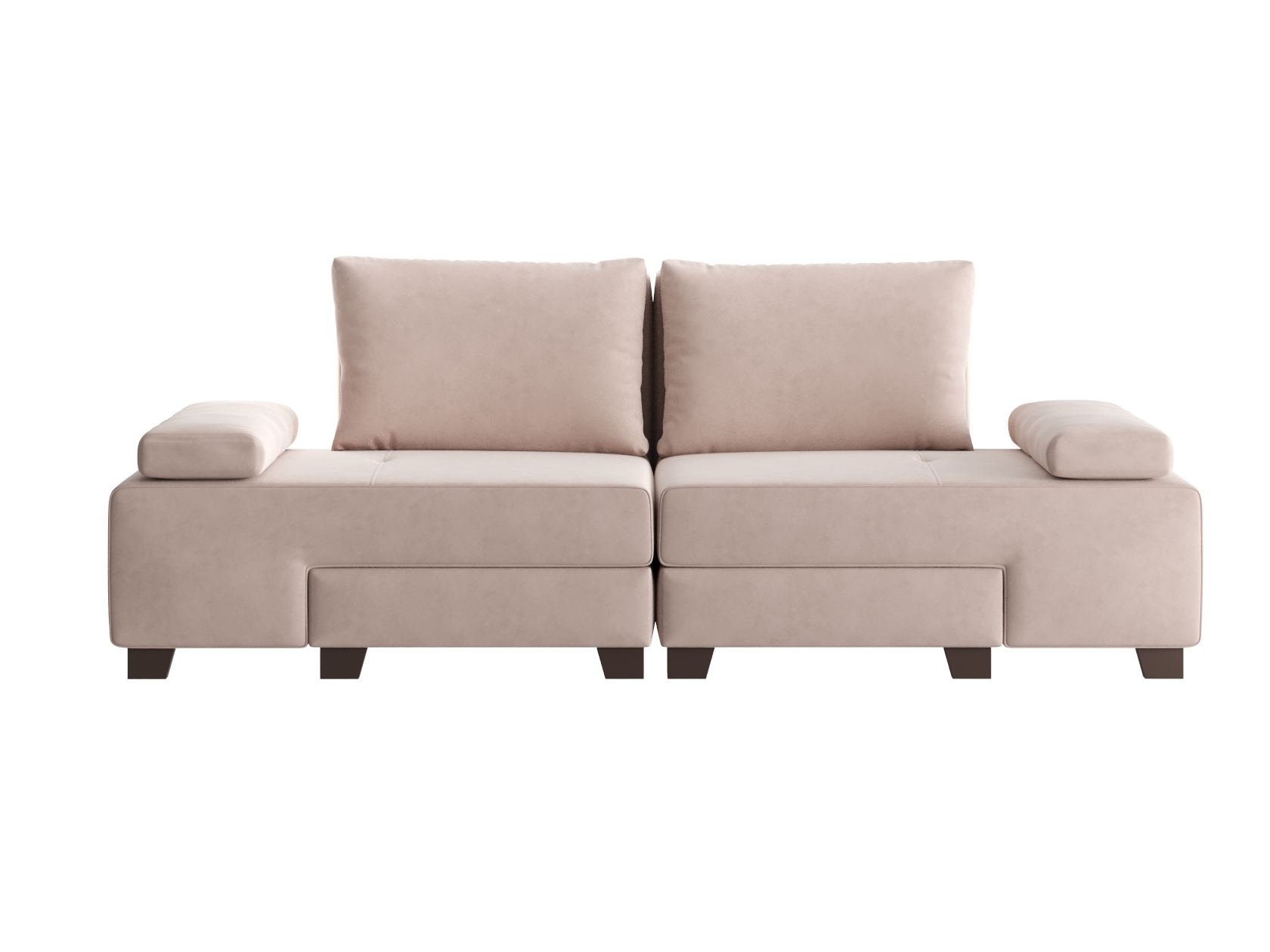 При раскладывании образуется большое спальное место, поэтому диван идеально подходит для отдыха и сна. Подушки, имитирующие подлокотники, добавляют мебели комфорт и удобство. Обивка из приятной на ощупь ткани создает уютную атмосферу, а небольшие ножки служат стильными акцентами интерьера.
