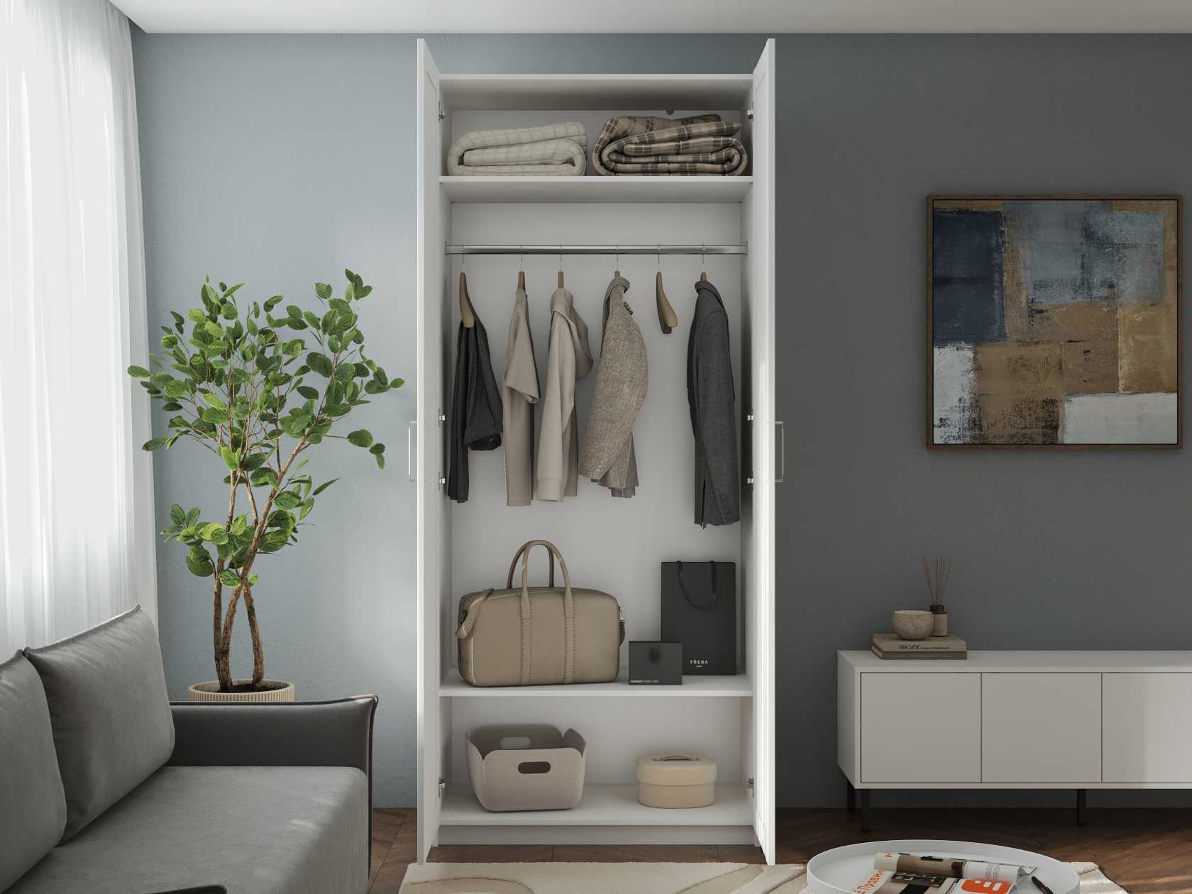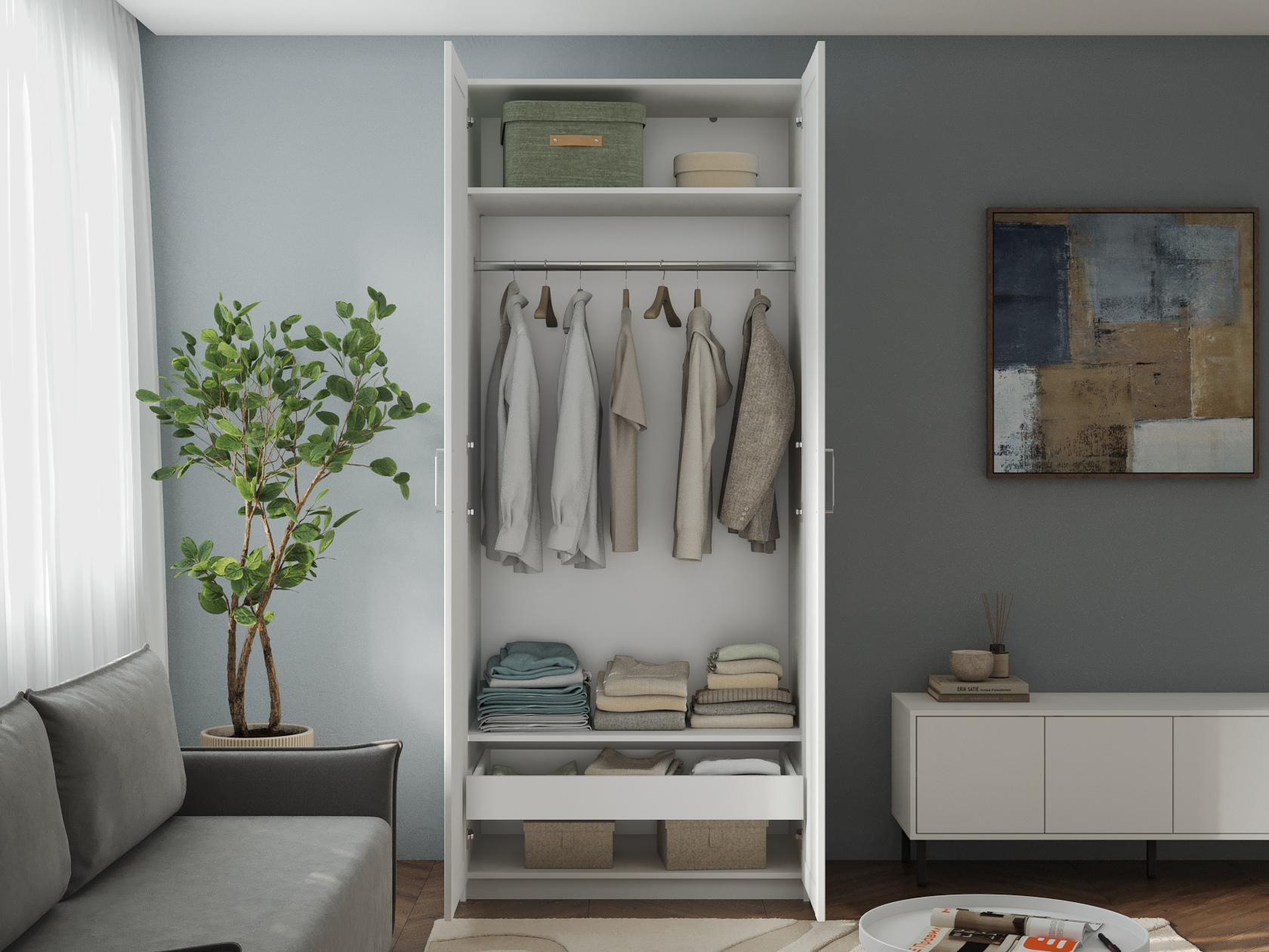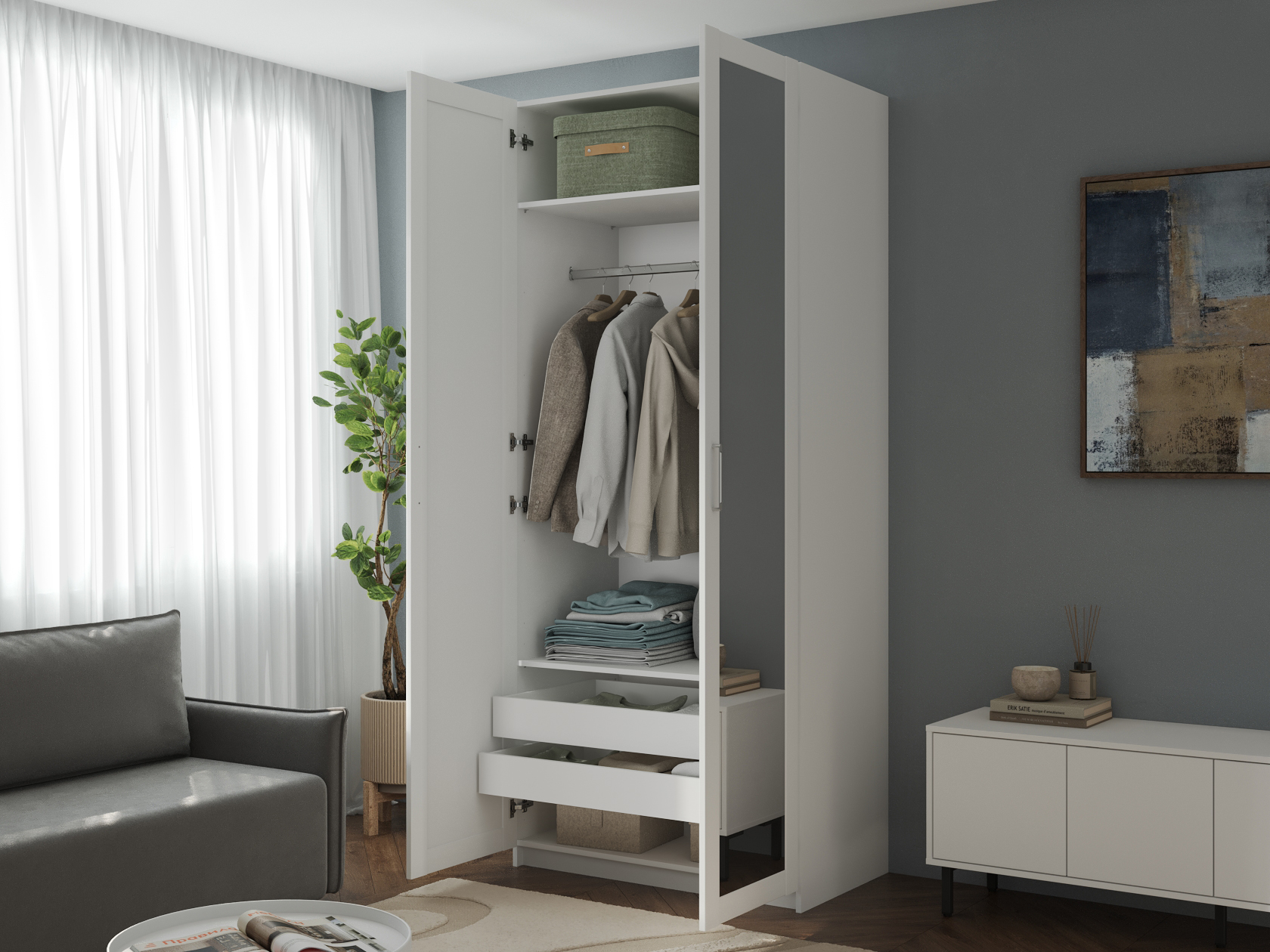 Внутреннее наполнение представлено секциями со штангой либо нишами для сезонных вещей и головных уборов. В небольших выдвижных ящиках удобно хранить полезные мелочи. Комплектация с зеркалом позволяет в деталях оценить подобранный образ и визуально расширяет пространство.